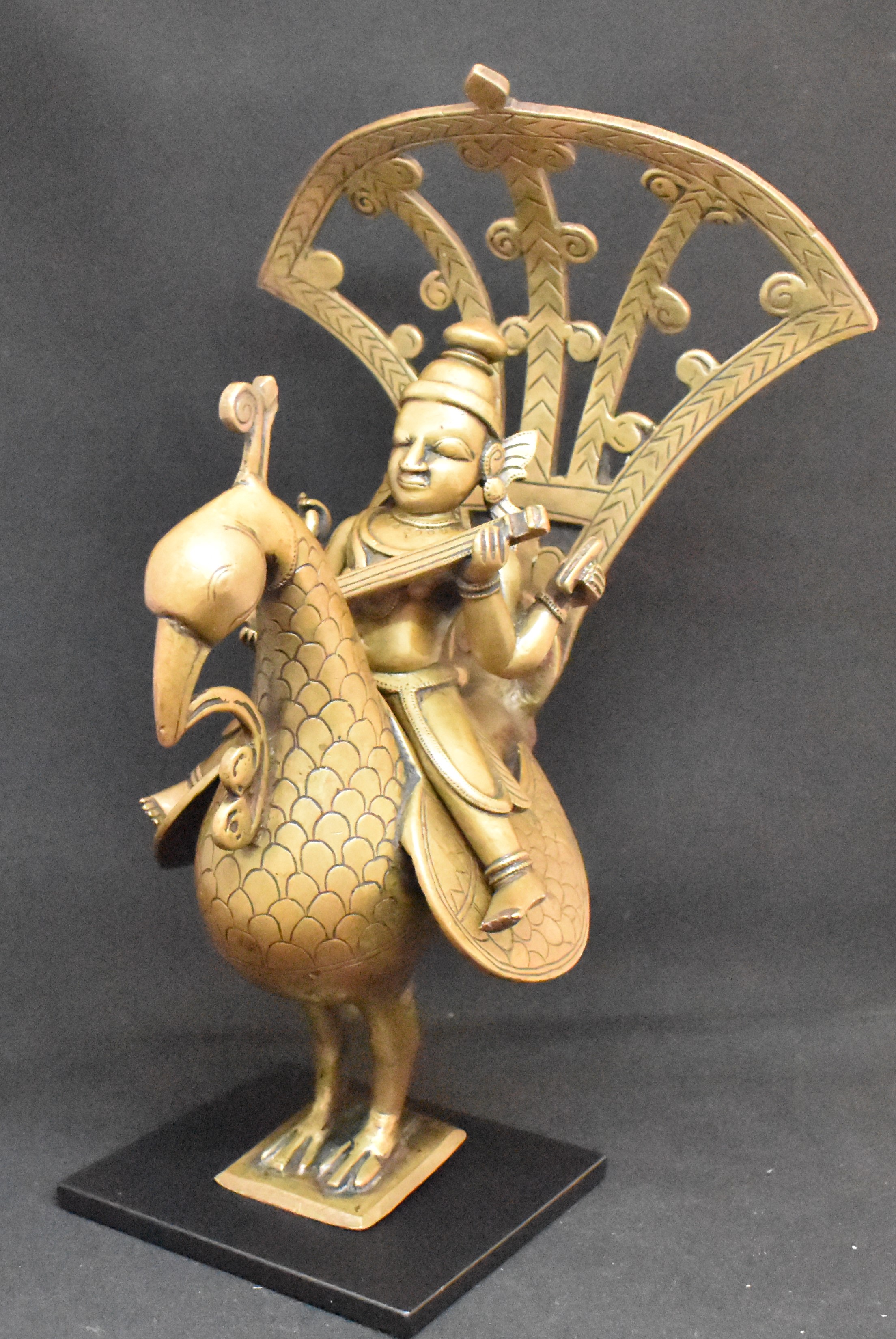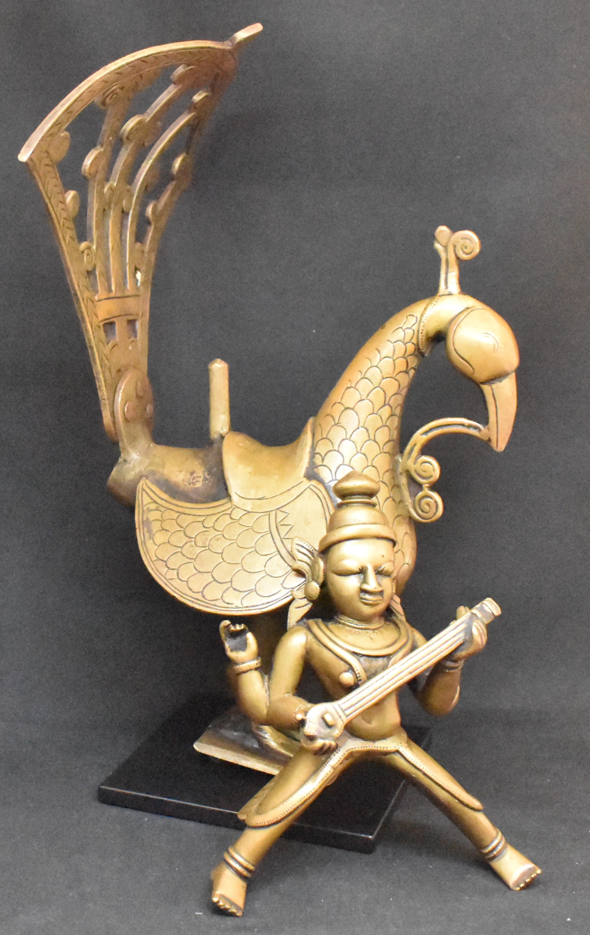 This is Saraswati, identified by Vina (a lute) in her front hand and Pustaka in her left rear hand. The rear right hand would have held Akshamala, now missing. Her Vahana, a peacock, is another story.