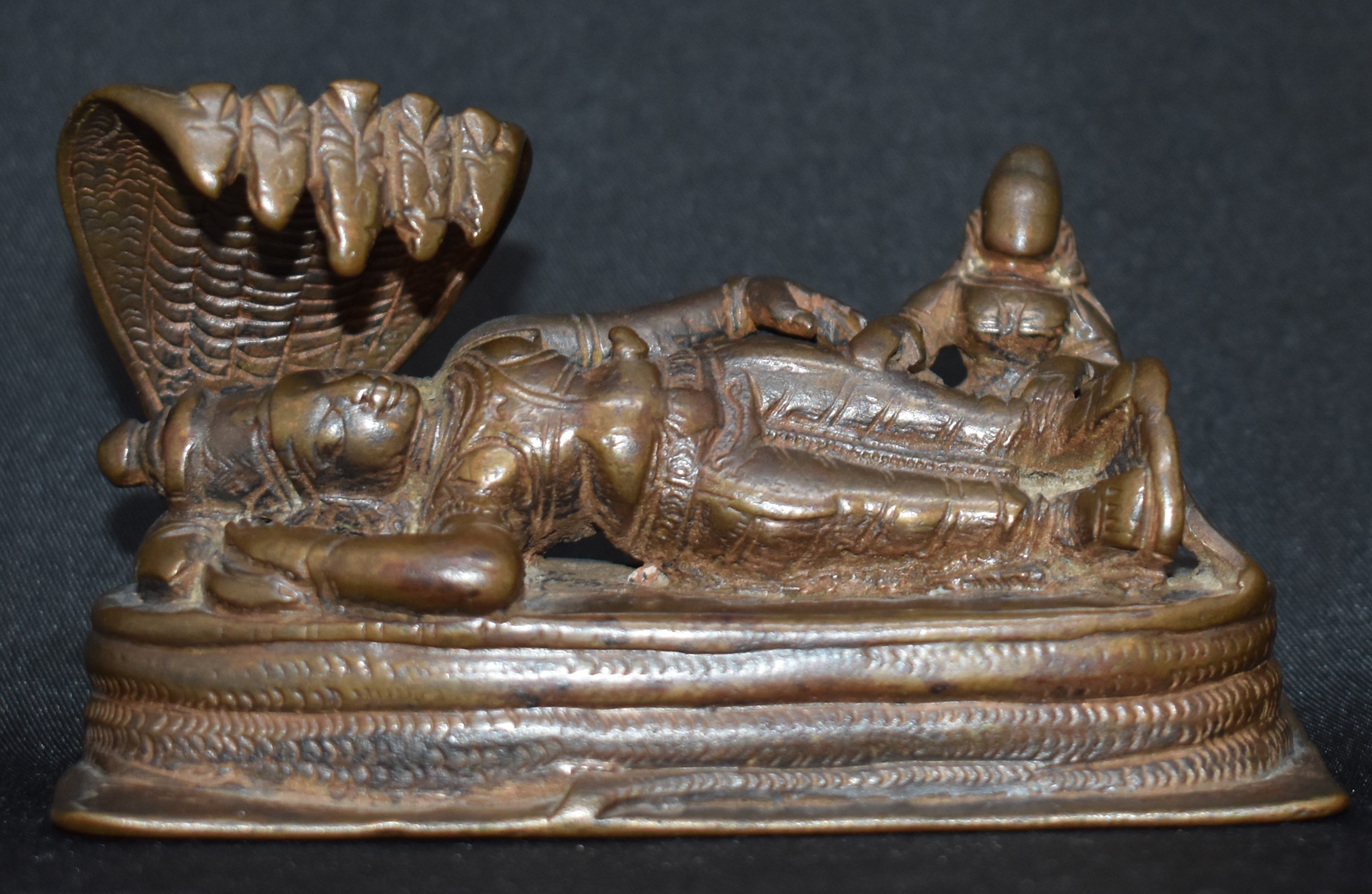 The second aspect that bothered me was the single Goddess massaging his feet. I have seen and have Vishnu accompanied by only one consort. Examples include Vishnu and Lakshmi from Himachal, Vishnu with Lakshmi at his feet. In those two cases, Vishnu is four-armed and carries his attributes. I decided to continue the search, to find a reclining two-armed Vishnu with only one consort.