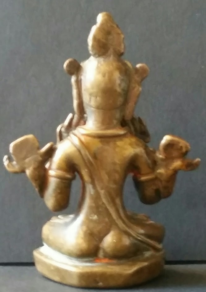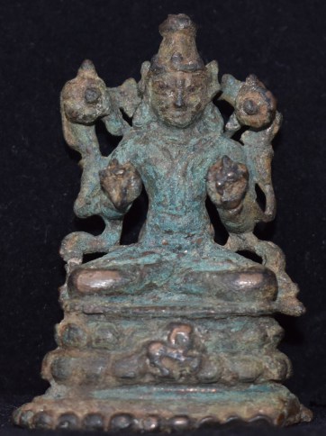 One of the features to note is the long sacred thread running from his left shoulder to his left thigh, pedestal and all the way back. Very long sacred thread. One other feature to note is the way hands are raised and are at a higher level than the lotuses. Normally the lotuses are at a higher level. See the example from the Pala period.