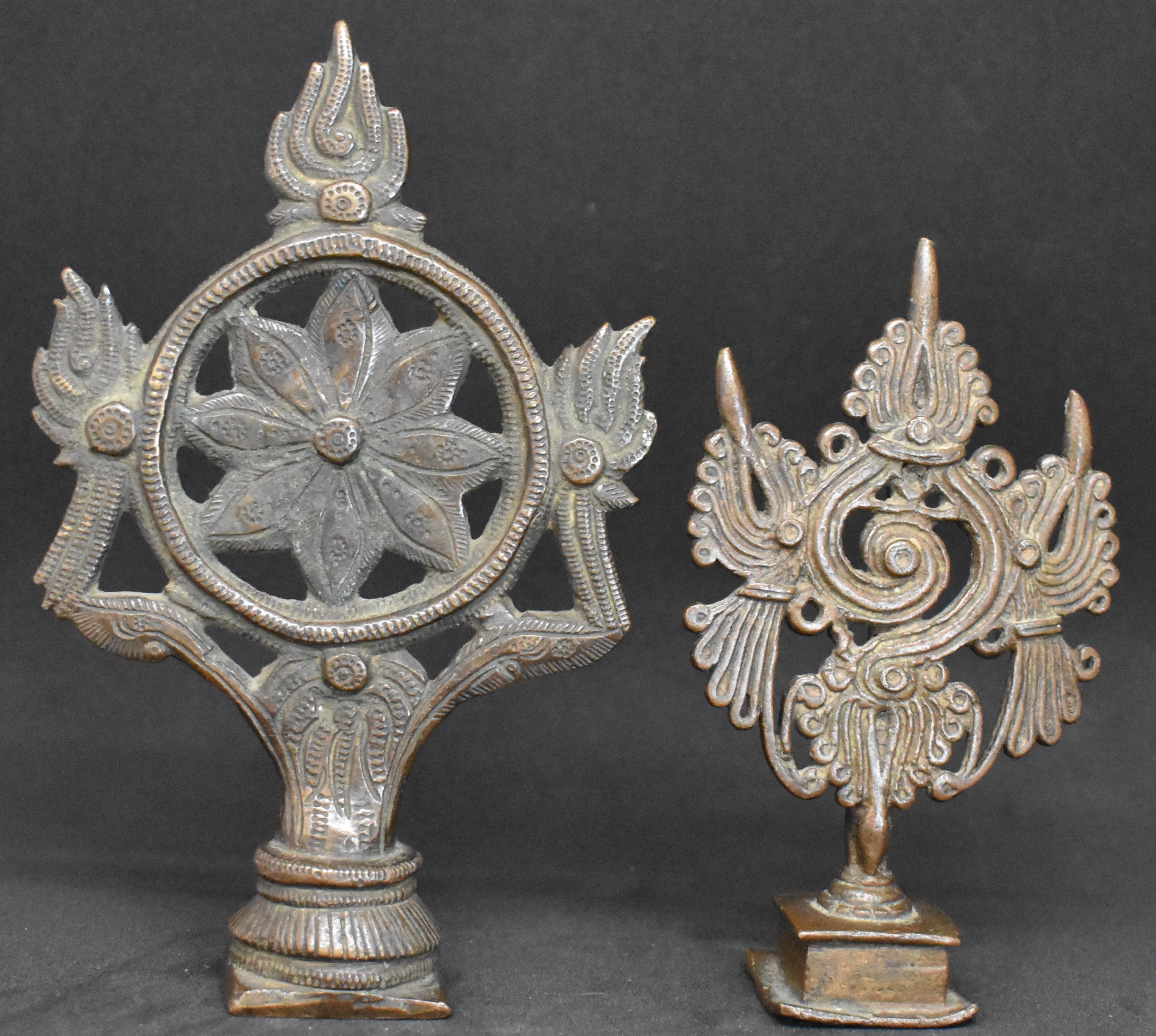 The bronzes, such as these, would have been kept in the inner sanctum next to or at the base of the main deity. In this case, considering their sizes, they may have been used in private worship. Obviously, they are not a pair (Differing height, design and base) and are published together as that is how they arrived, but with a description ‘they are flowers’.