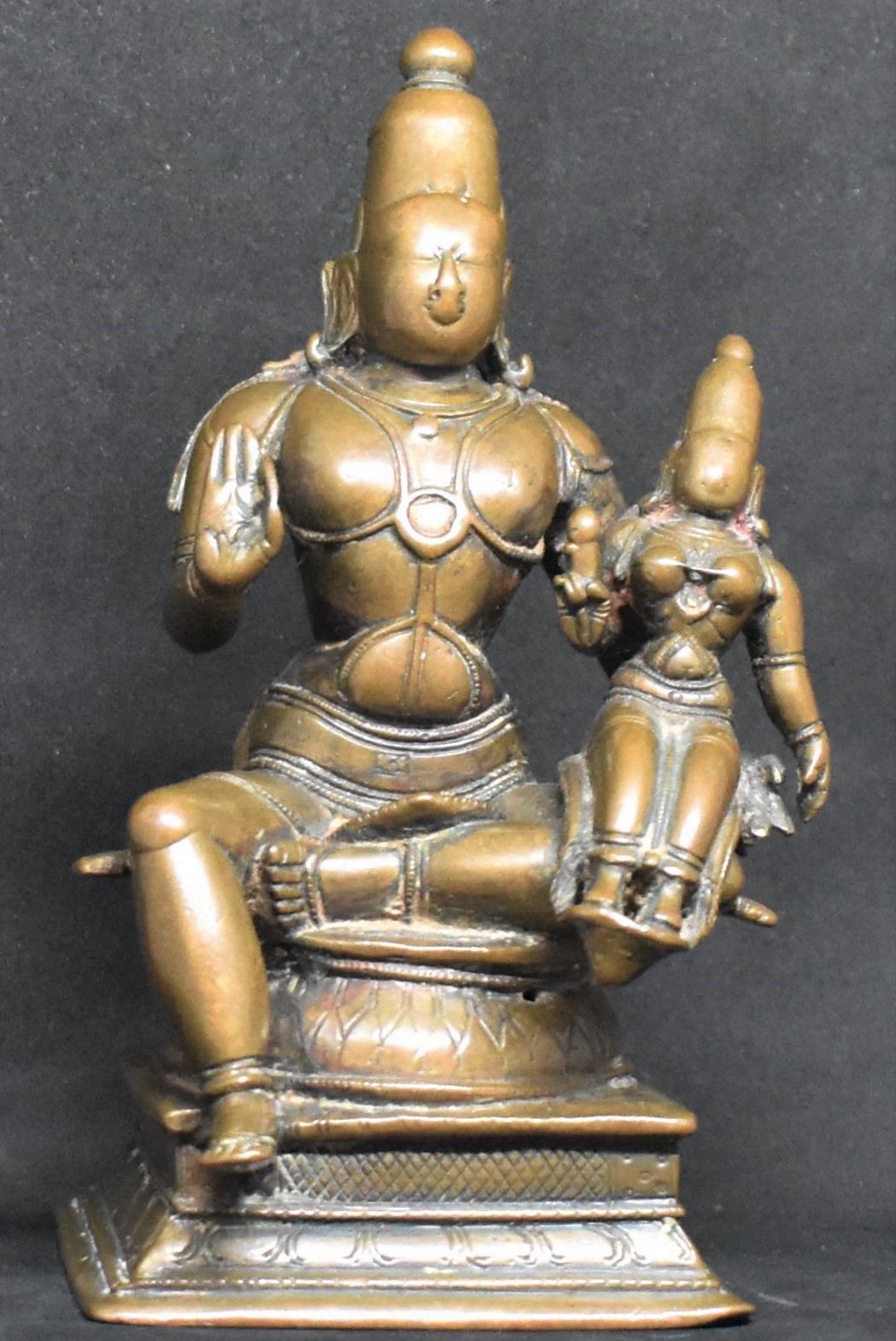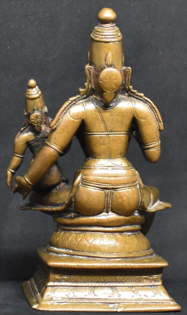 The tall cylindrical crown are typical of Vigrahas influenced by the Vijayanagar period. The copper rich alloy and the general styling point to Tamil Nadu.