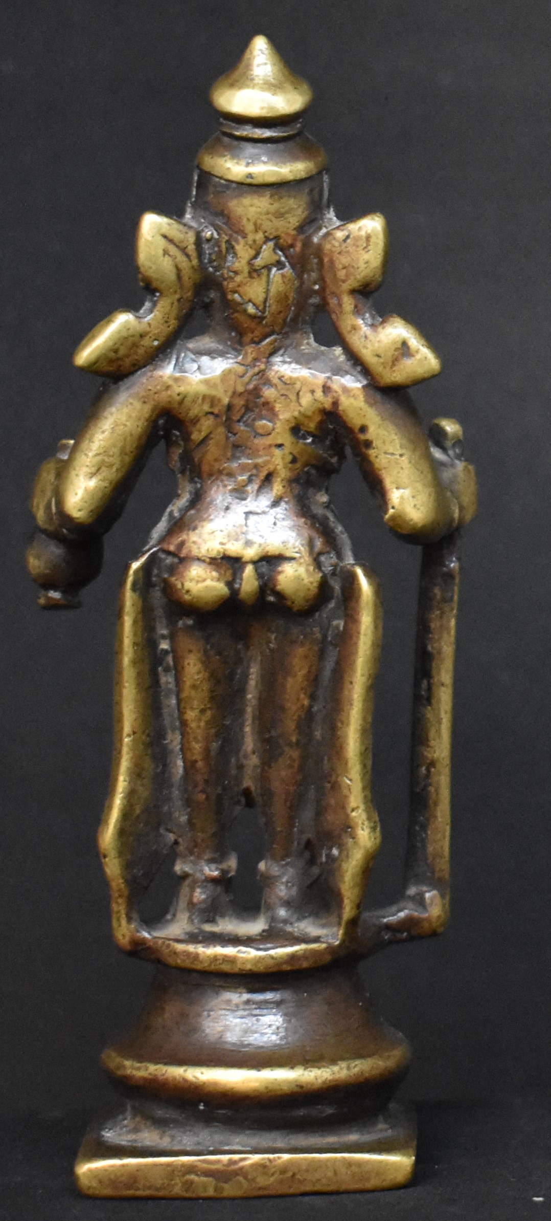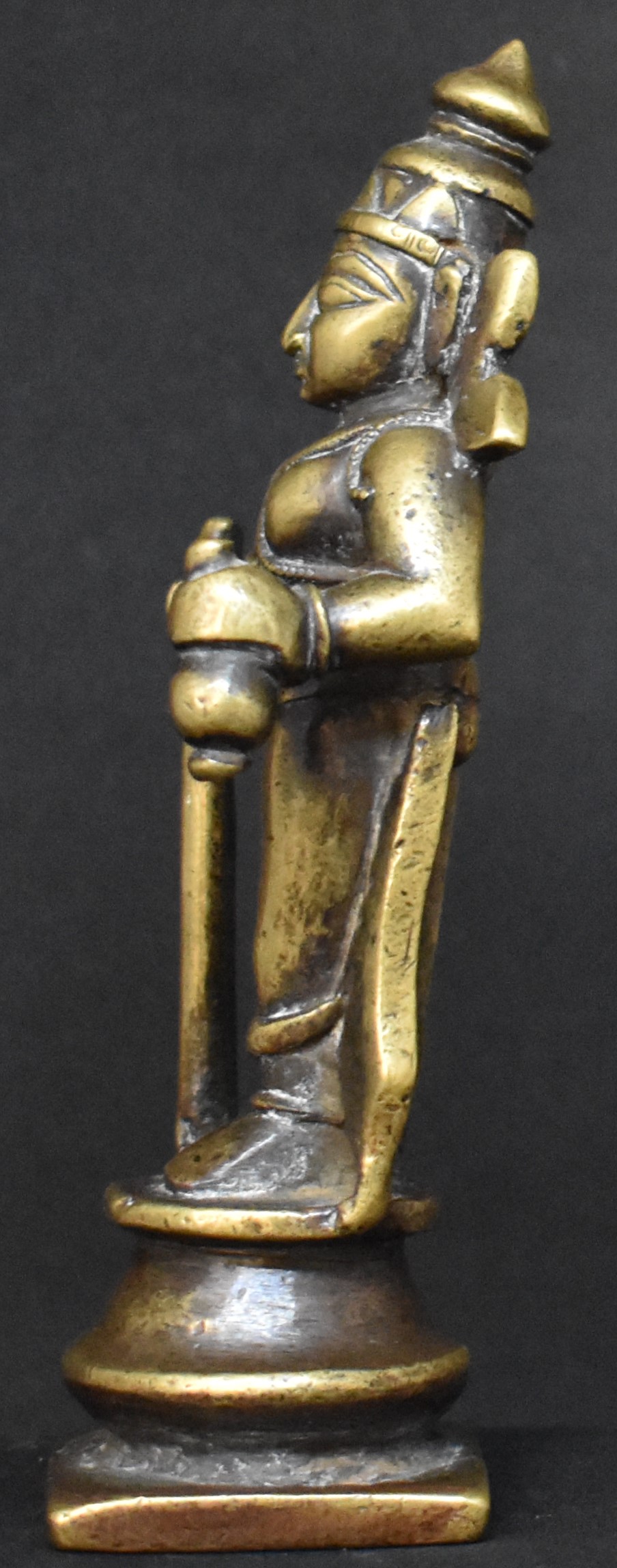 This bronze is about 11.5 cm in height. It shows wear and signs of use. This may not be earlier than the nineteenth century and may even be from early twentieth century. It is almost certainly from Northern Deccan (North Karnataka/South Maharashtra)