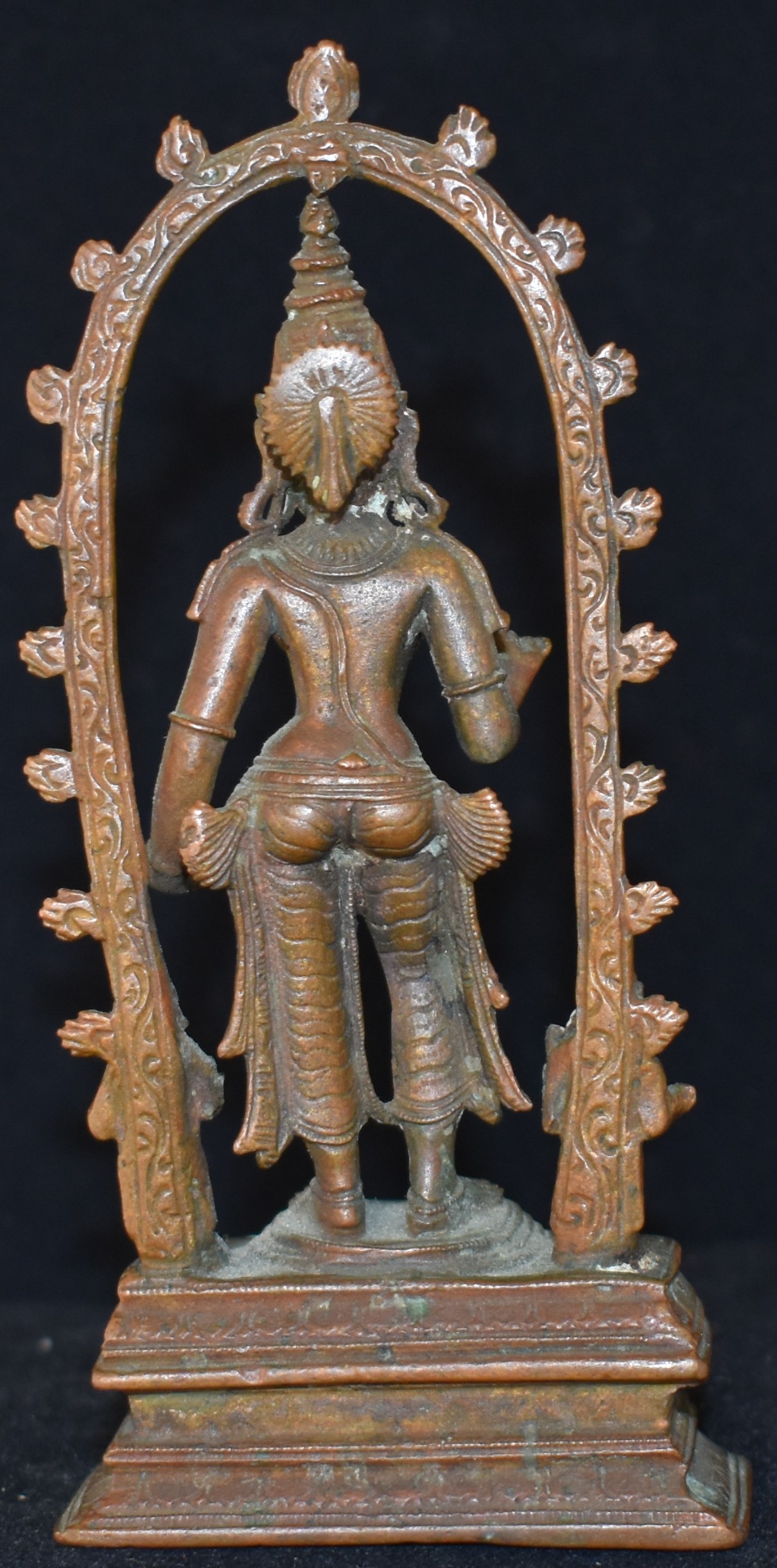 The incision of lotus on the pedestal, high copper content and the subject itself points to Tamil Nadu as the origin. There is some wear showing handling and this may date prior to the nineteenth century.
