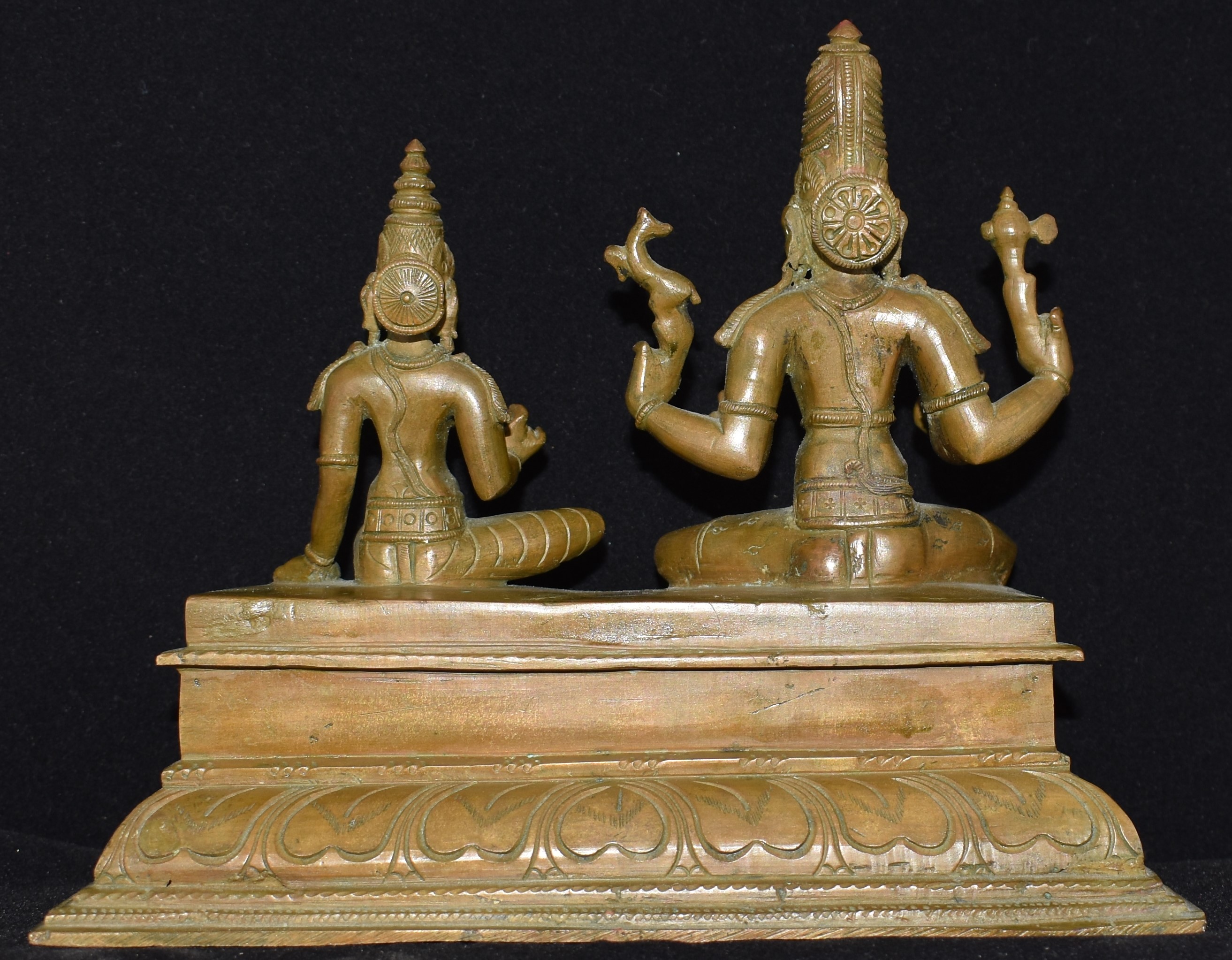 Somaskanda is one of the most common forms of Siva. It is found only in South India and mostly in Tamil Nadu. Siva, Uma and their son, Skanda, are on the same pedestal (Bhadrapeetam). Skanda may be standing or seated or dancing. In the above example, he is missing. That explains the hole next to Siv’s left leg. Siva, right leg hanging down, and Uma, left leg hanging down, are seated comfortably (Sukhasana).