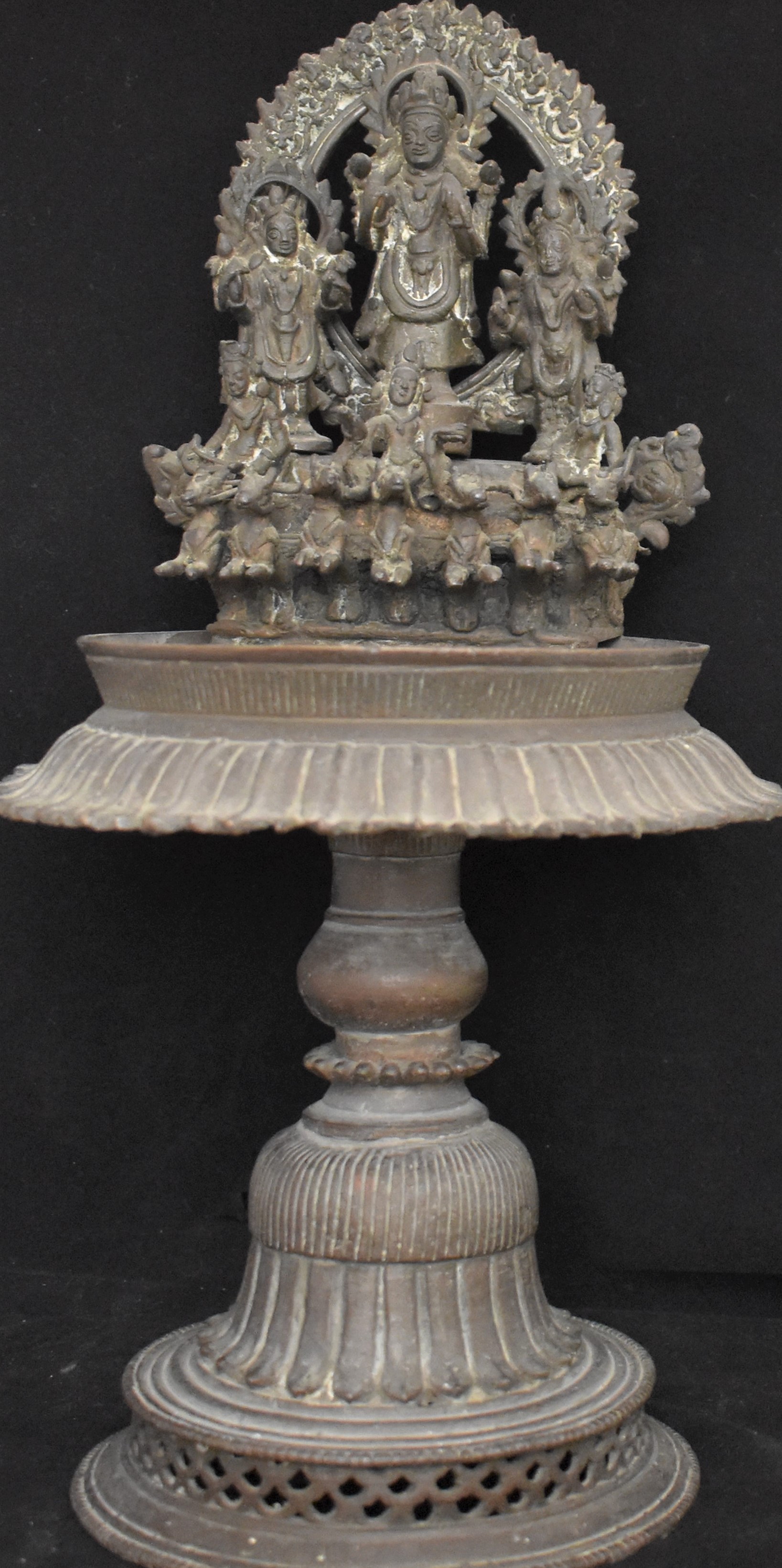 This is a Nepali lamp with Surya. It showcases Newari craft at its best. Surya is identified by the lotus he holds in each hand, a chariot driven by seven horses and Usha and Pratusha on the sides with bow and arrow.