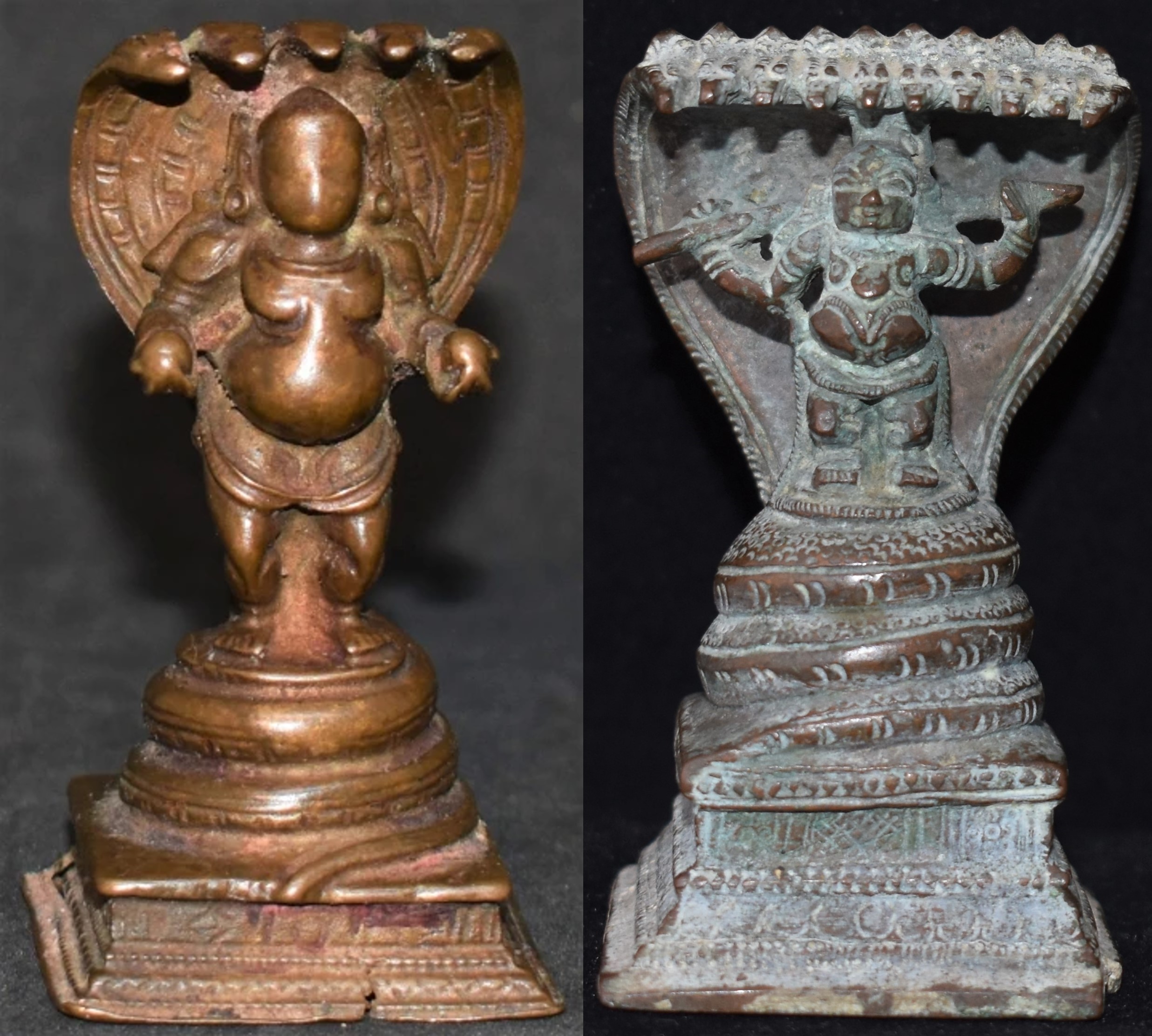 The unusual aspect is the five-hooded cobra under which he is standing. Deities standing under Cobra hood are common among Vaishnavite Vigrahas. Below are two examples of Krishna standing under Cobra hood.