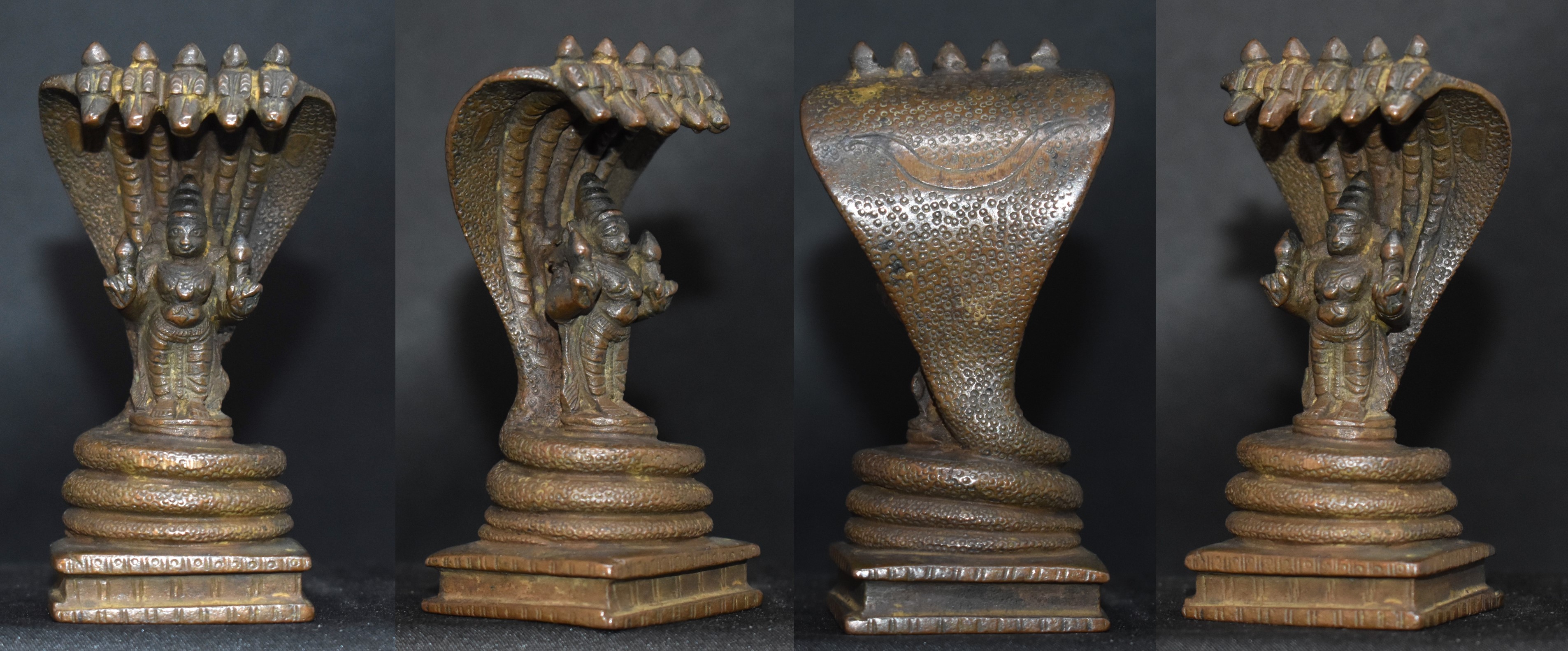 One of my collector friends suggested this may be a representation of Naga, the snake God. A search of Nagakal, did not give any positive results. Where a human-like figure is shown in Nagakal, they are shown in Anjali Mudra.