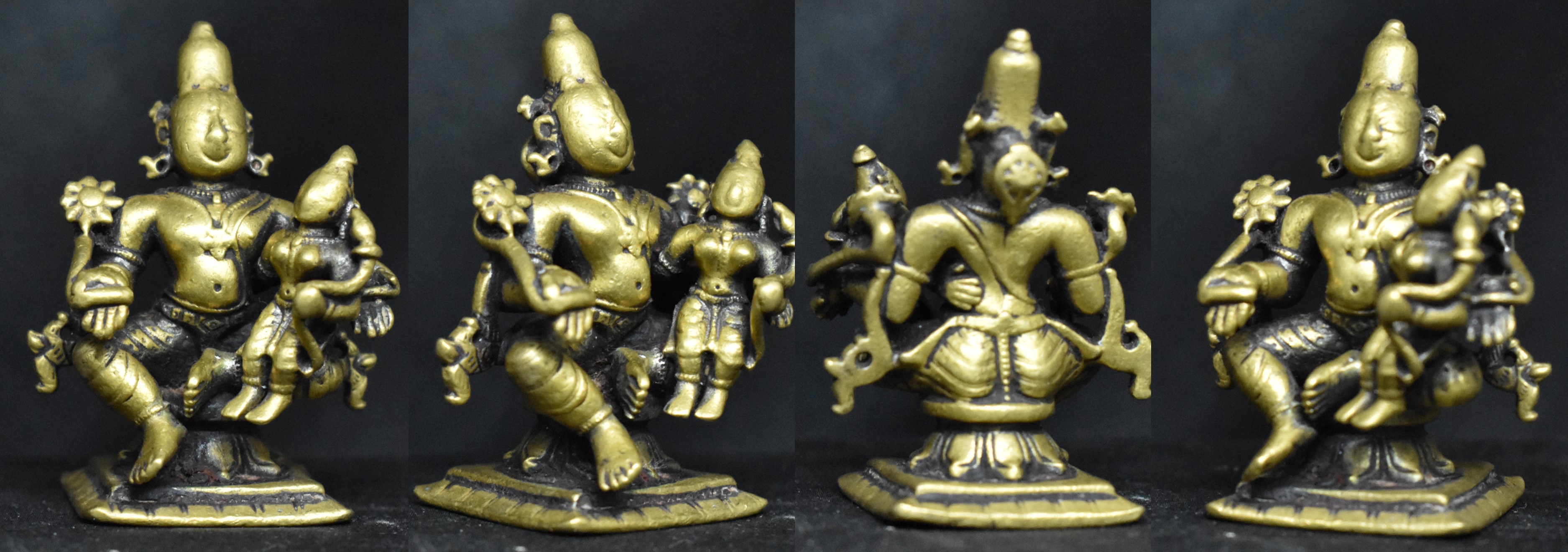Surya is identified by the two lotus flowers in his hands. Surya’s consort is seated on his left lap. Surya’s bronzes with his consort are rare. Normally, Surya is depicted riding his chariot or standing by himself.