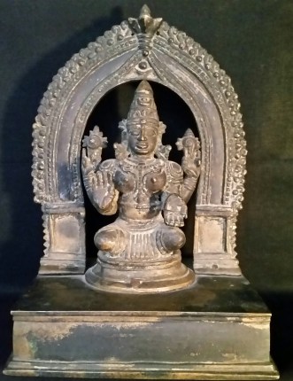 This is Vaishnavi, female energy of Vishnu, from Kerala region. Her upper hands are holding chakra (discuss) and shankha (conch shell). Typical attributes of Vishnu. Her lower hands are in abhaya (…