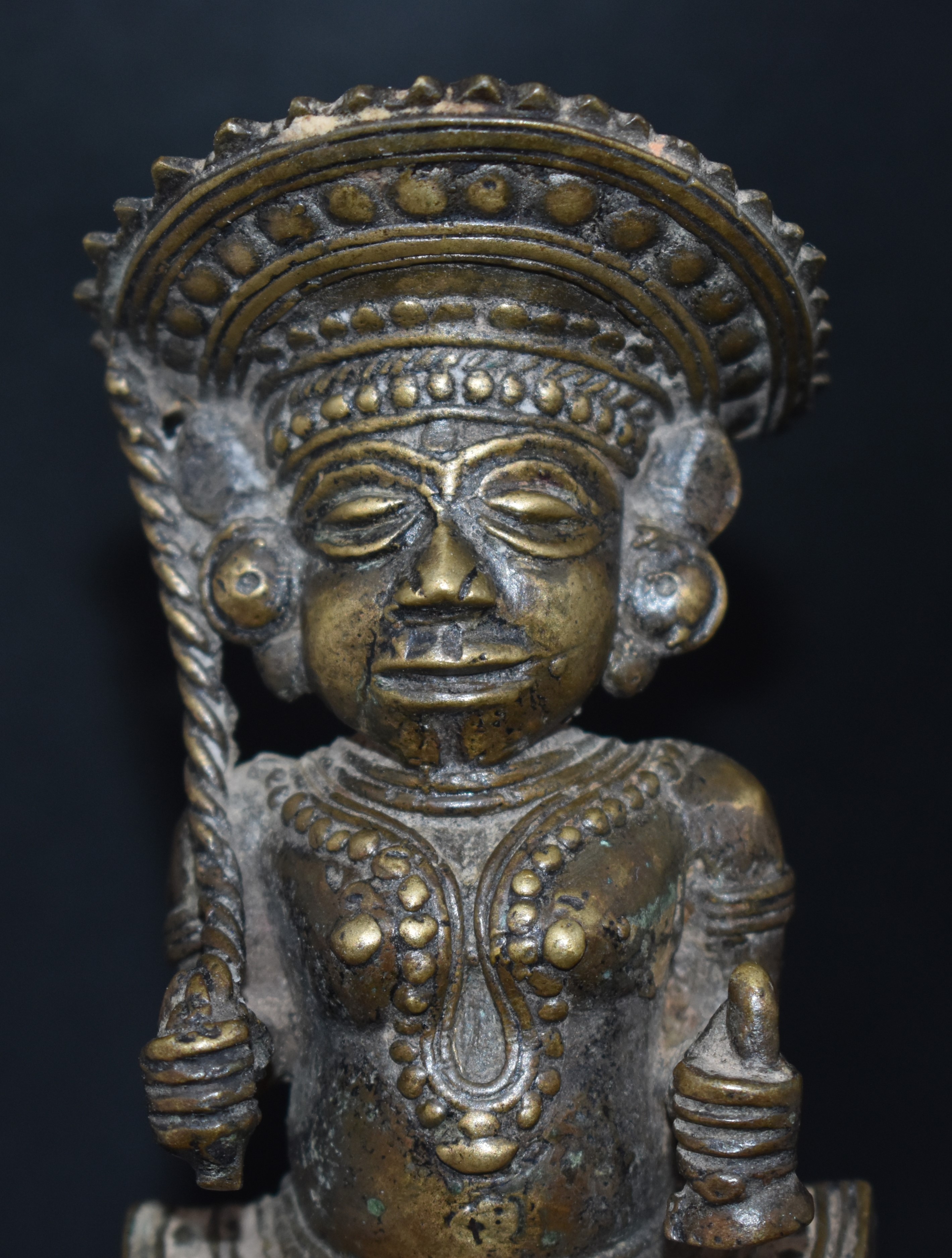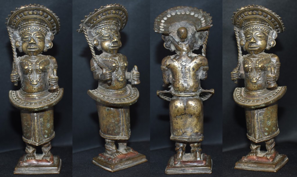 In this example, the Theyyam is holding a sword and shield. The decorative band on his waist is Ani. This figure is about 16 cm in height and it is from Kerala. It may not date earlier than the nineteenth century.