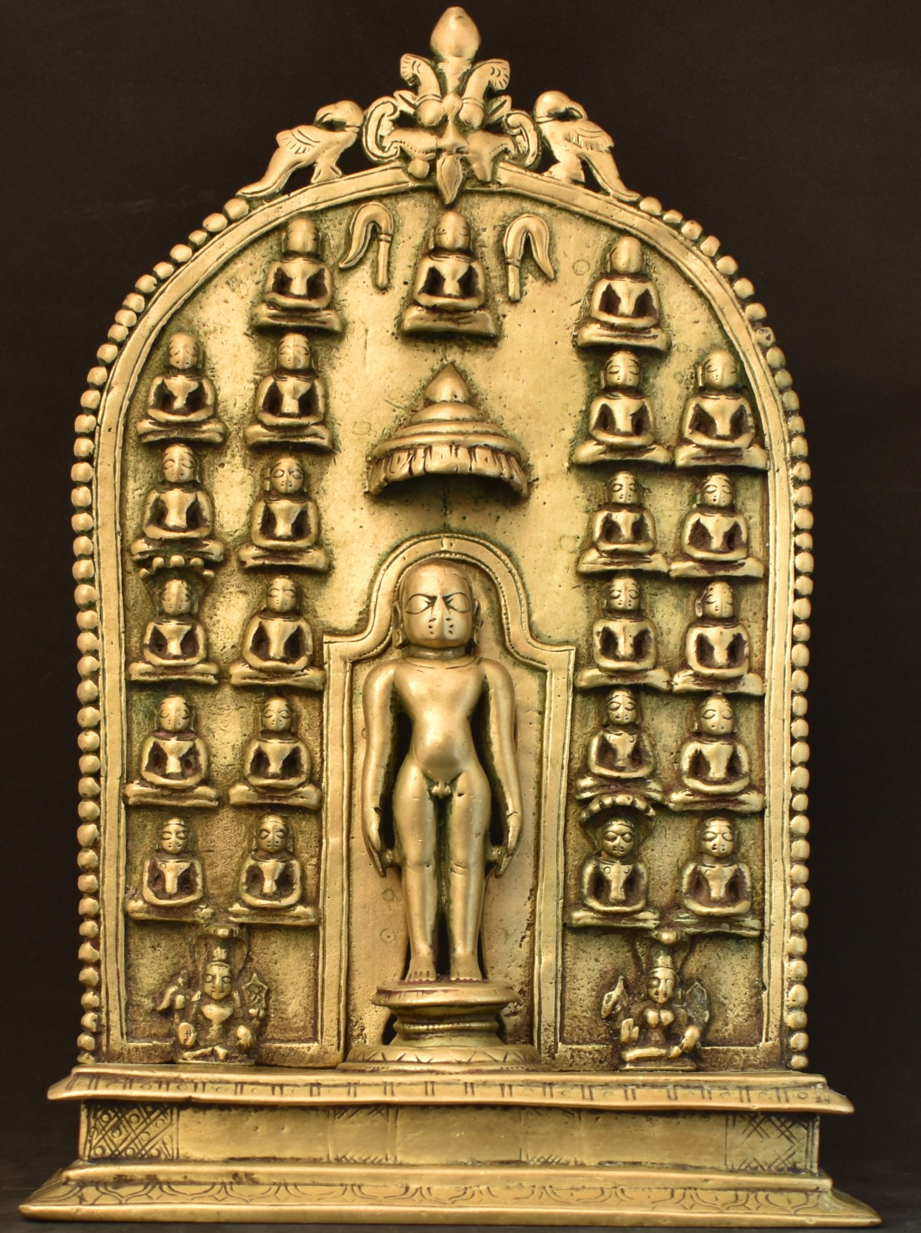 The standing Thirthankara is surrounded by twenty-three seated Tirthankaras, showing the entire pantheon of Tirthankaras. In the absence of cognizance, it is not possible to identify Tirthankaras.