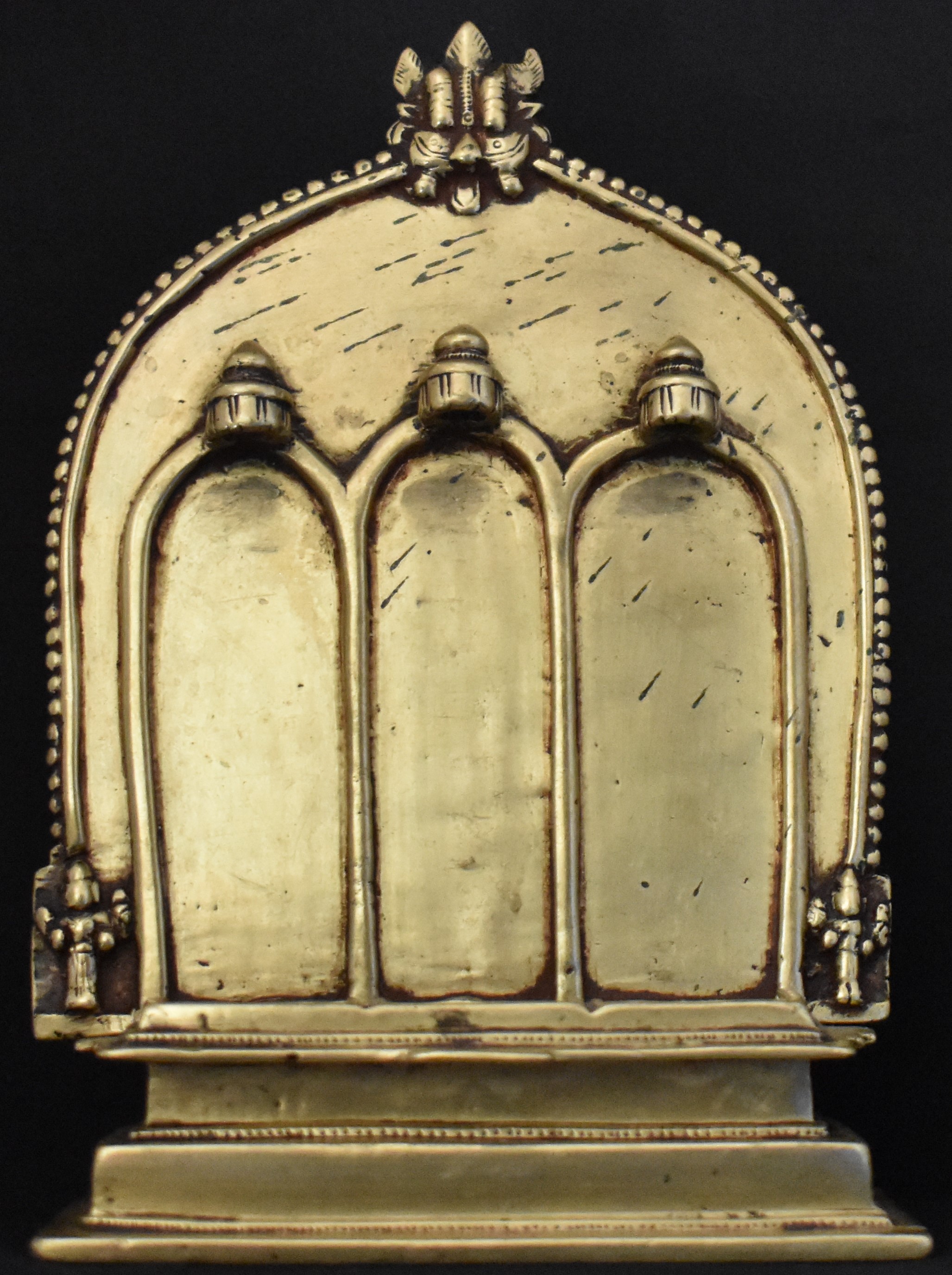 The Kritimukha at the top of prabhavali, the attendant Yaksha and Yakshi at the base of prabhavali suggest this bronze is from South India. As in the photo below, the prabhavali has three niches, each topped by a parasol. The finish is smooth.