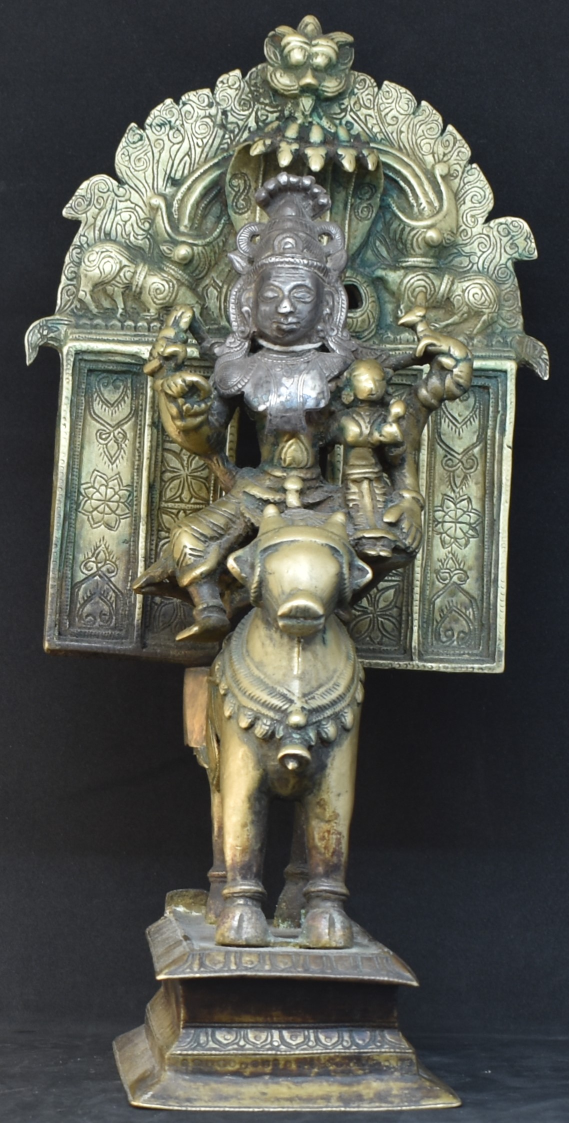 - The backplate is the classic Makara, Kiritamukha and five-hooded cobra style. Narrowing down the region from where this idol could be from. The quality engraving on the backplate is something we do not see often. The number of patterns engraved and the lower portion being split into four parts are worth taking in.