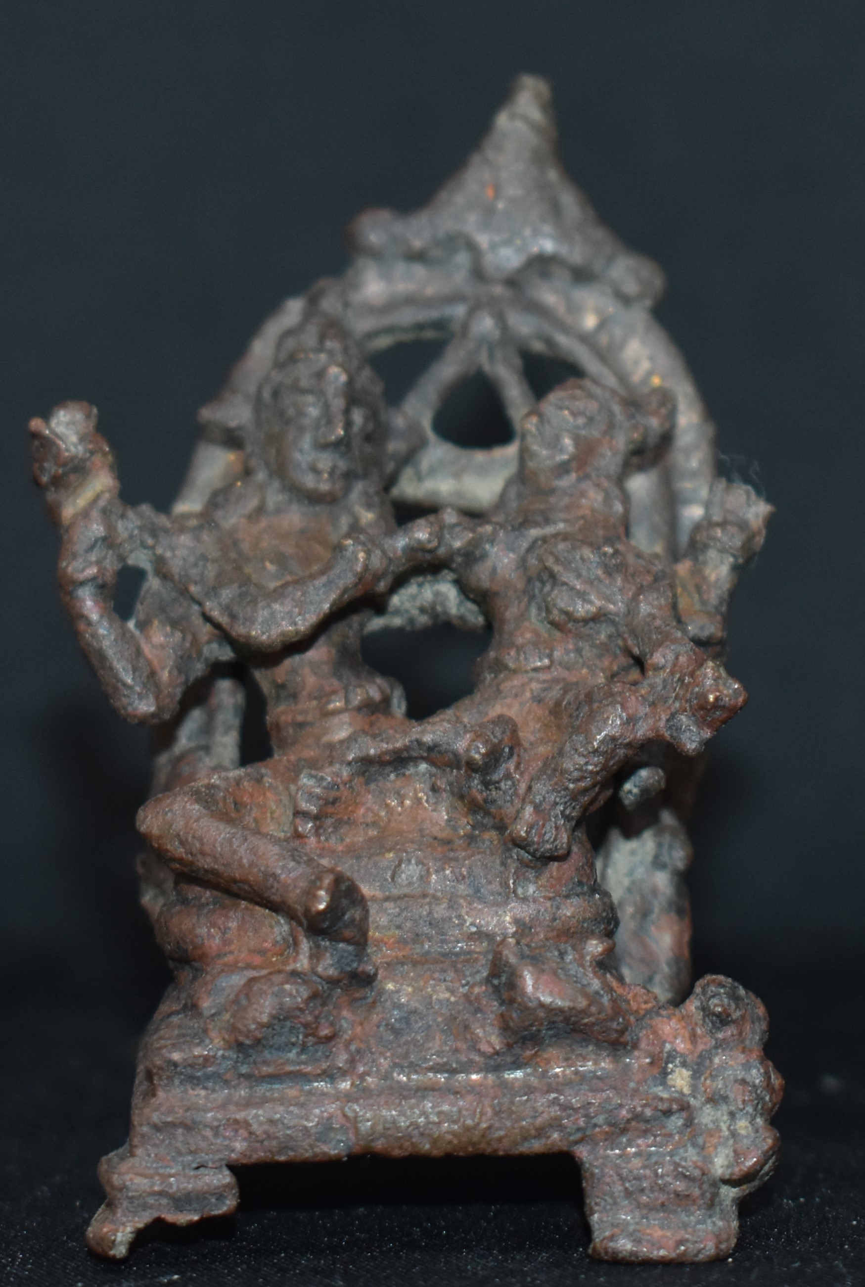 Four deities, two vahanas and one donor. The Vigraha is about 7 cm in height and is a complex piece for its size, This bronze may be dated to the 11th century CE and attributed to the Pala regime. Nalini Kanta Bhattasali, in the book ‘Iconography of Buddhist and Brahmanical Sculptures in the Dacca Museum‘, refers to this iconography as Alingana Murthy.