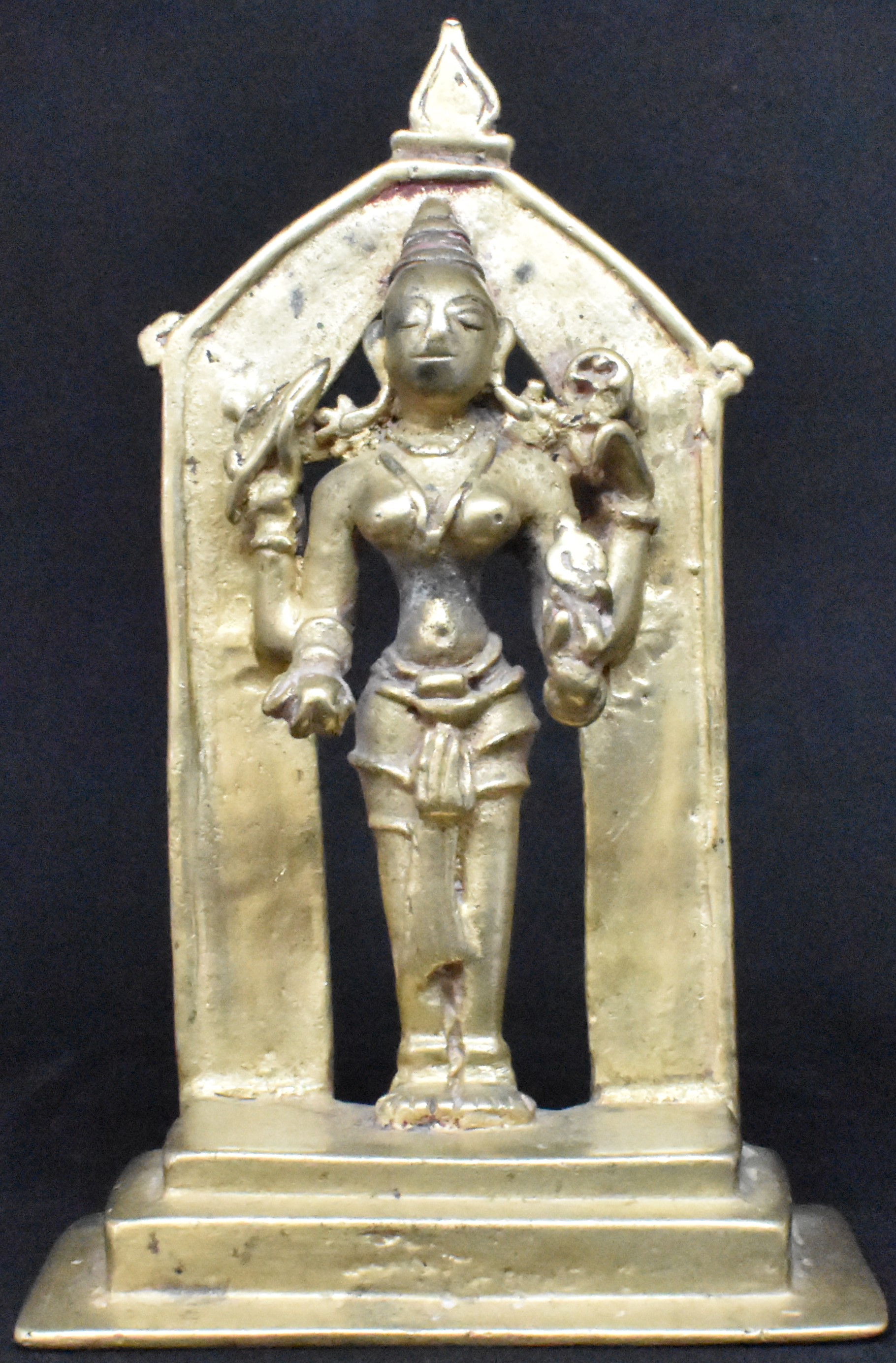 The colour of the metal, the long ear ornaments, stepped crown and plain prabhavali suggests this bronze is from North Deccan.