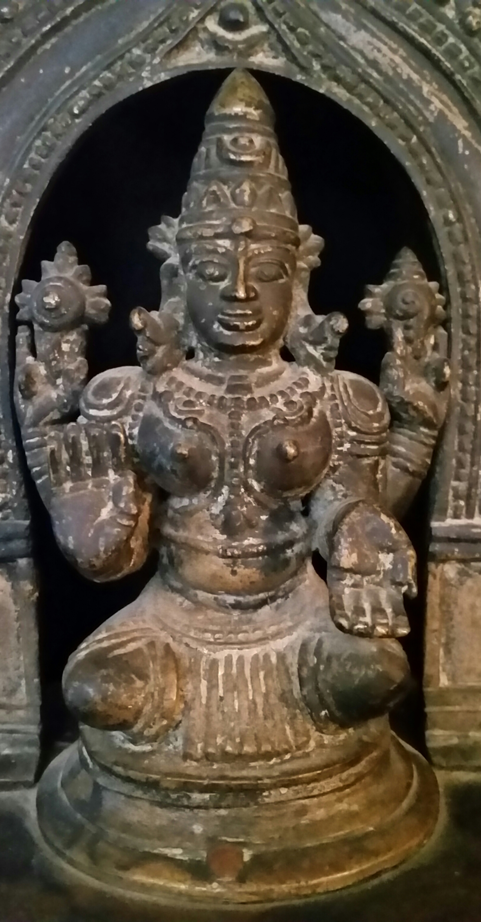 The goddess is set back on the platform, a typical feature of Kerala bron