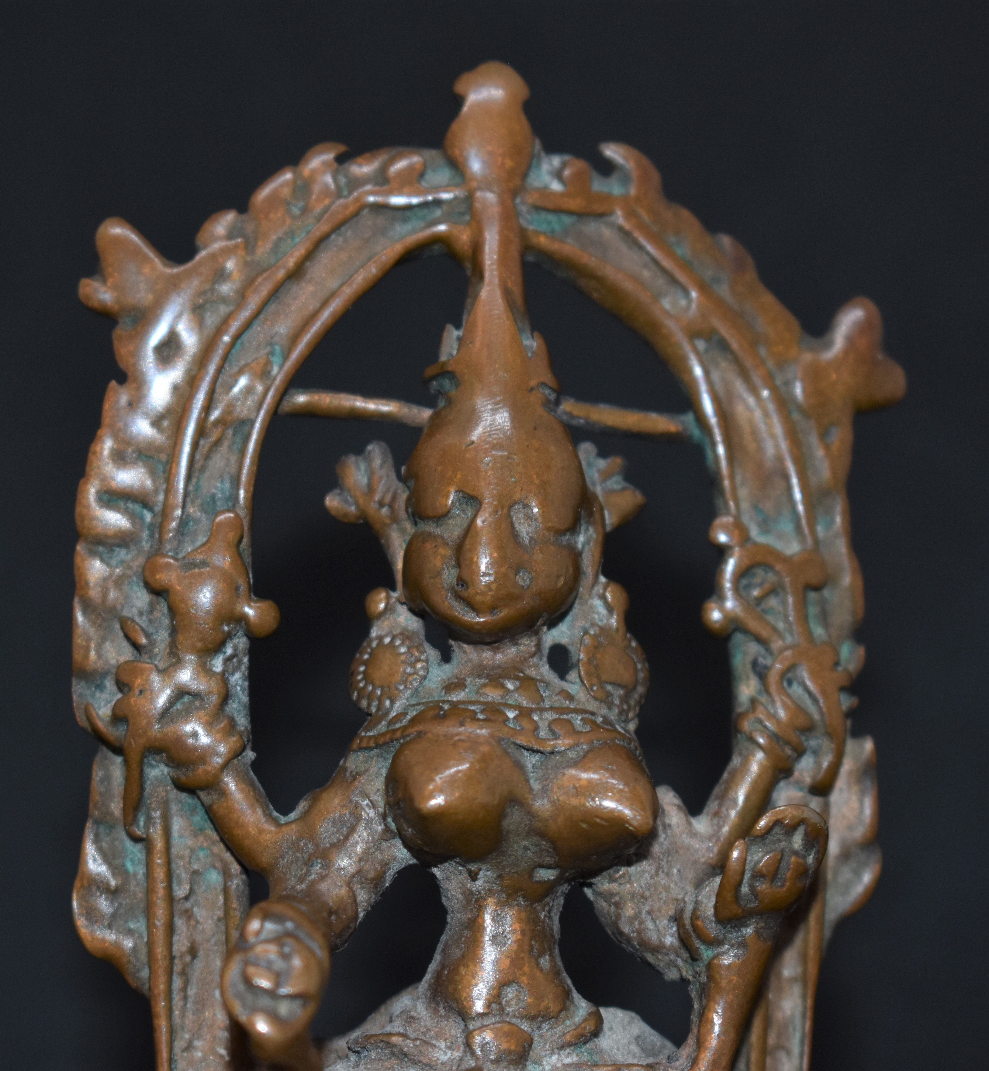 The half dome-shaped peetha is an unusual feature and so are the decorations on the dome and the ridges on the prabhavali.