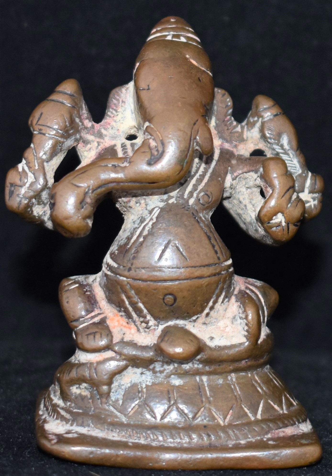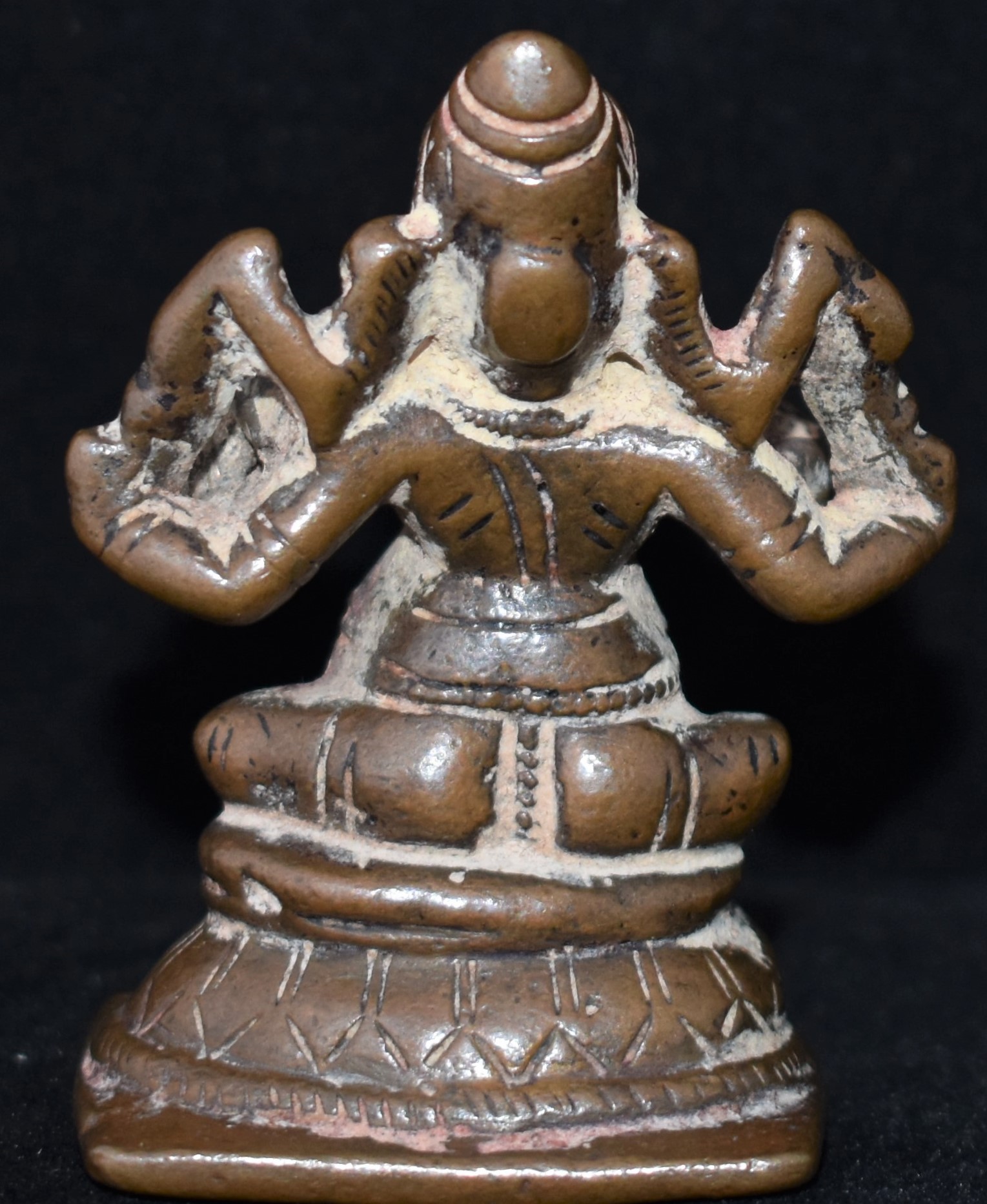 This bronze shows considerable age, in terms of ritual wear, accumulation of worship-related material and deep patina.