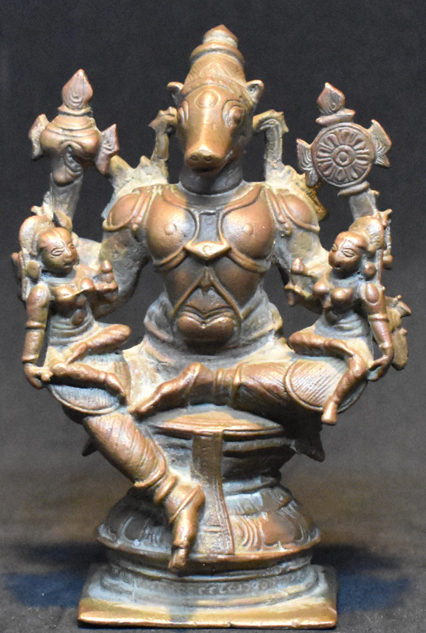 There are several forms of Varaha. This could be either Lakshmi Varaha with Sri and Bhu and embracing them or Yajna Varaha, seated on a throne with Sri and Bhu. Varaha with one consort, esp Bhu Varaha (rescuing of the Earth form) is more common.