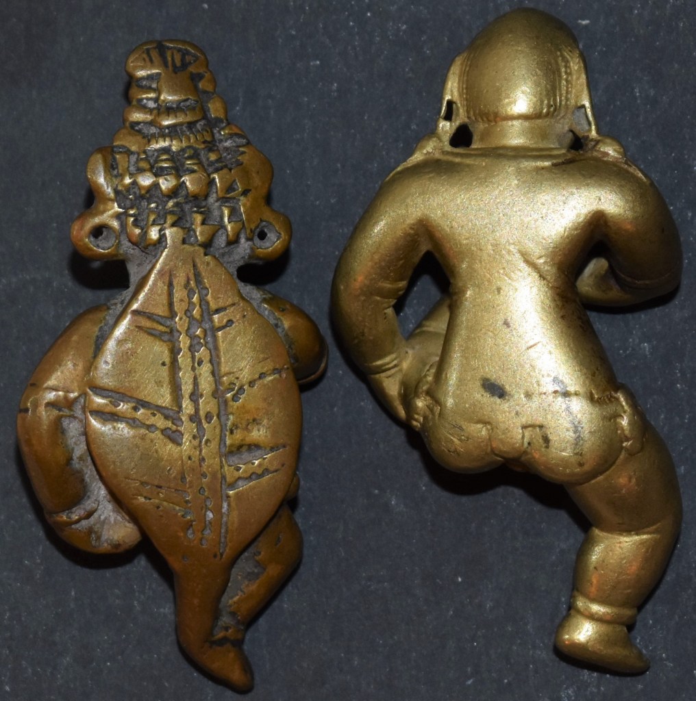 The brass one is from Karnataka and I have no suggestions on the other one, though the crown is trying to tell us something.