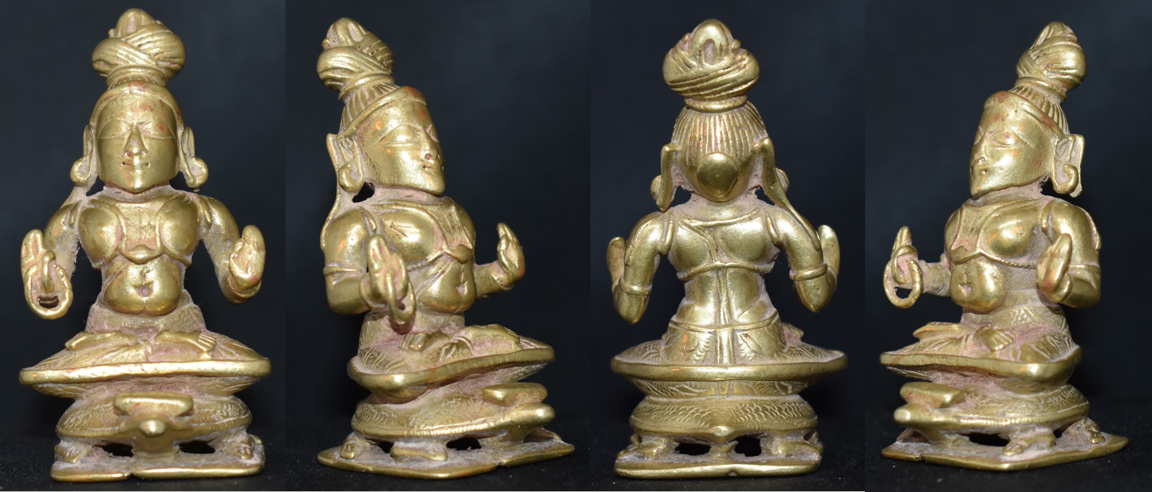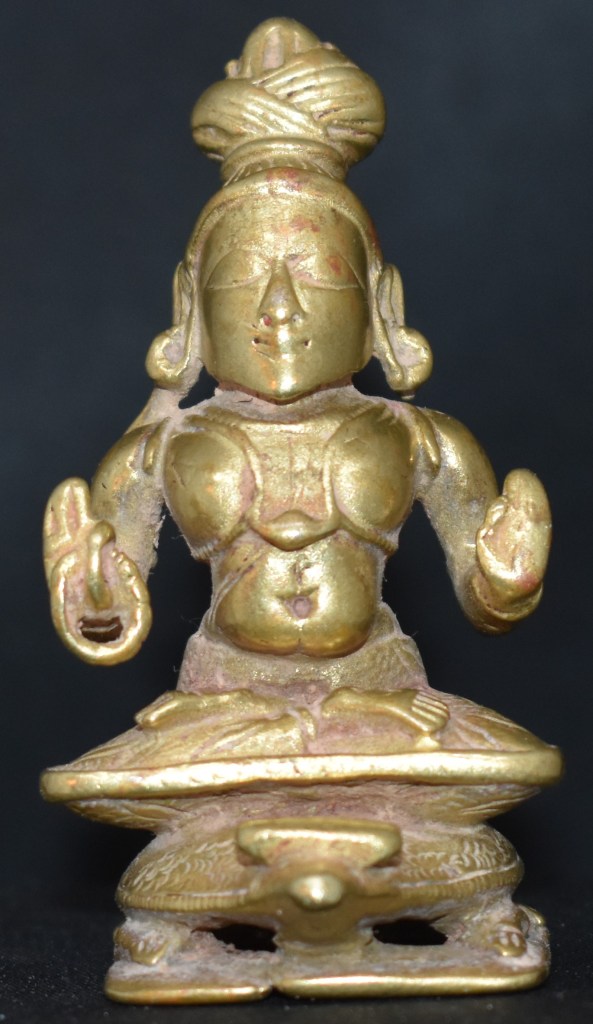 This icon is about 6 cm in height. The golden yellow color has remained untarnished. Locally the alloy is known as sonpital, meaning golden brass. The Vigraha, going by the material used, is from Sangili-Kolhapur region of Maharashtra.
