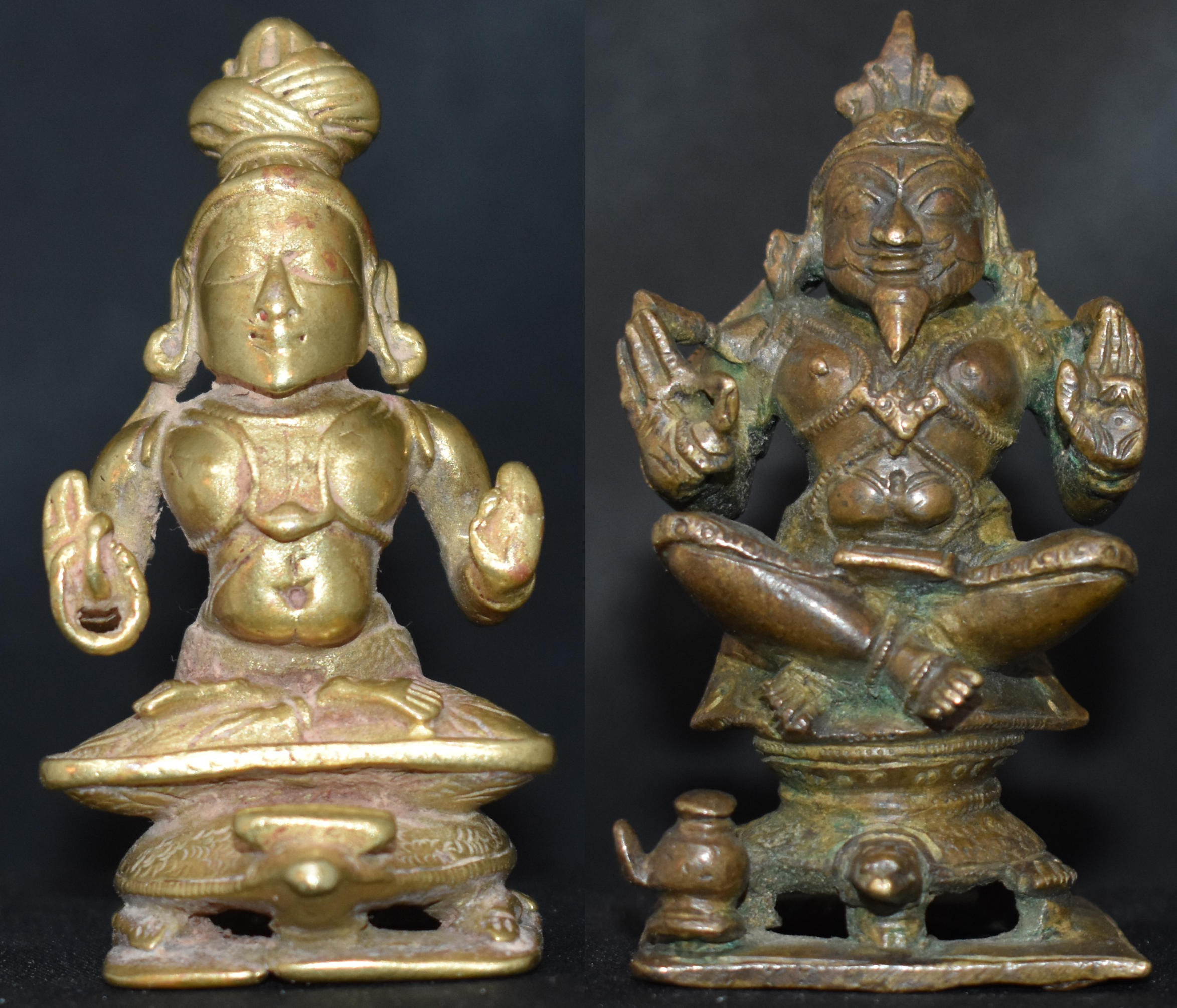 In this bronze, he is shown seated on a turtle in Padmasana wearing Yogapatta. The scriptural text, in the form of palm leaves, is resting on the turtle, an unusual arrangement.