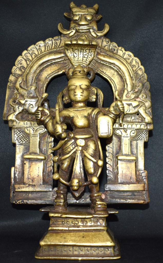 This large (31 cm tall) Vigraha is Veerabhadra and is identified by his attributes. He holds a sword, arrow, bow, and shield, in a clockwise fashion, starting with his lower right hand. It is surprising in the case of four-armed Veerabhadra the order in which the attributes are held is the same.