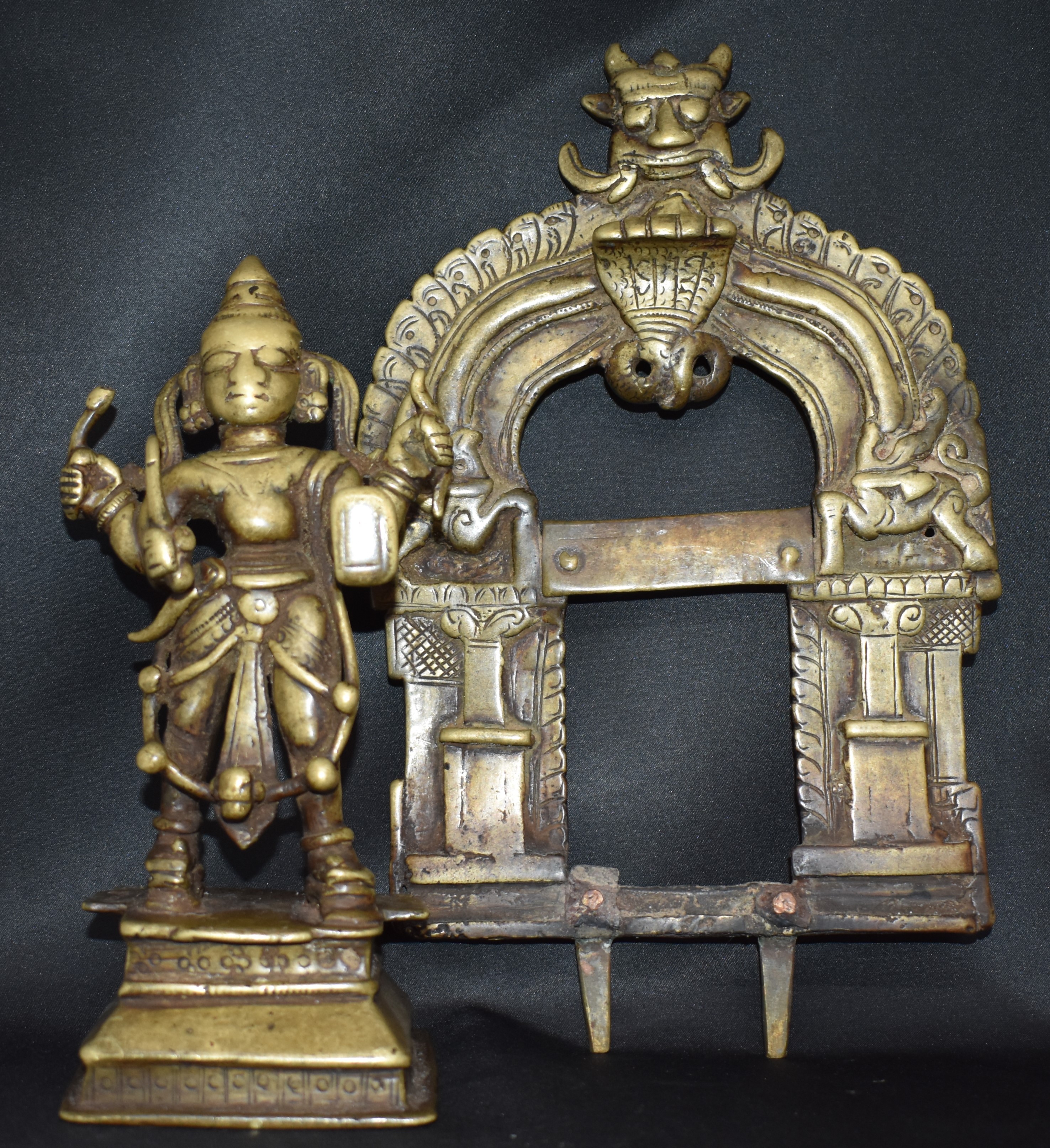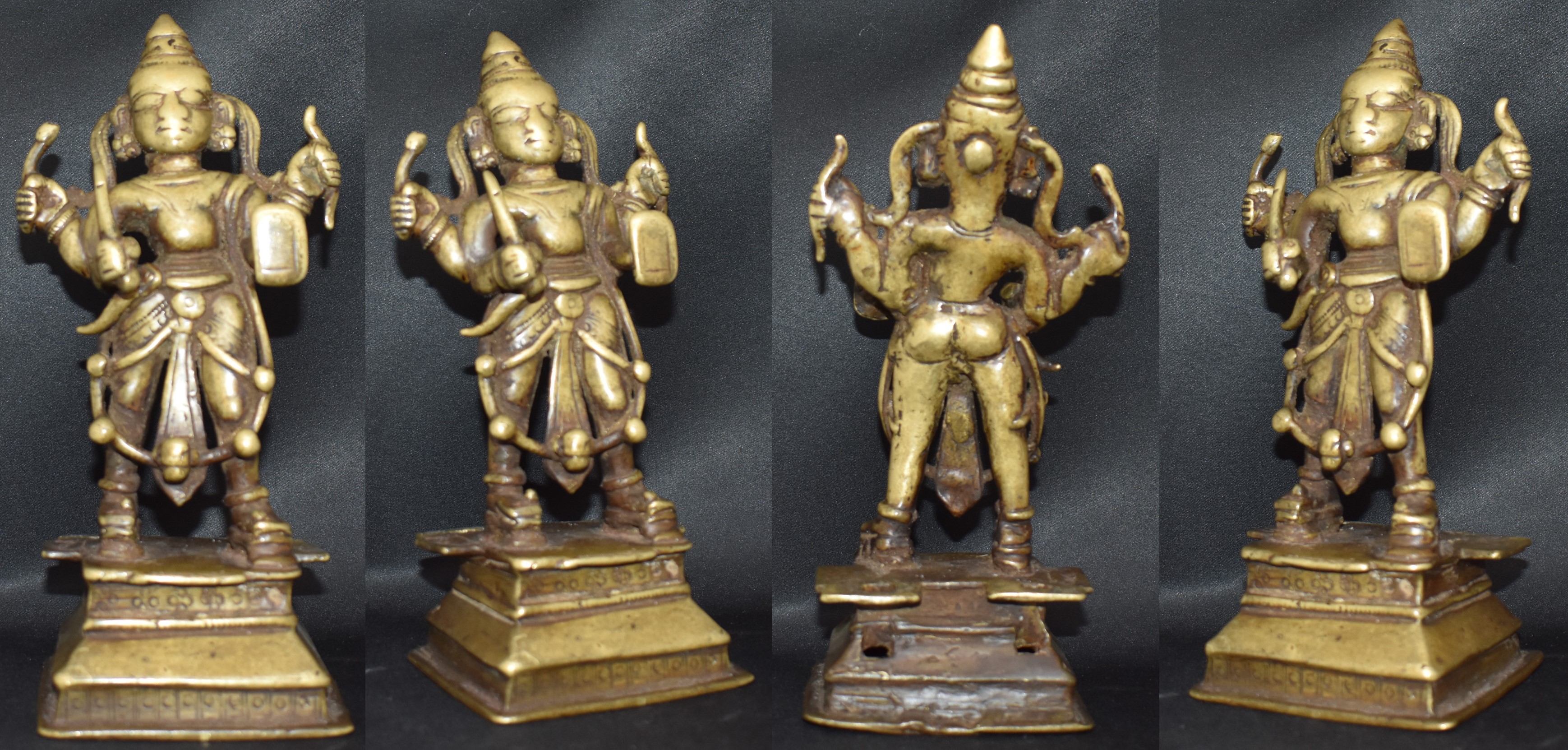 This large (31 cm tall) Vigraha is Veerabhadra and is identified by his attributes. He holds a sword, arrow, bow, and shield, in a clockwise fashion, starting with his lower right hand. It is surprising in the case of four-armed Veerabhadra the order in which the attributes are held is the same.