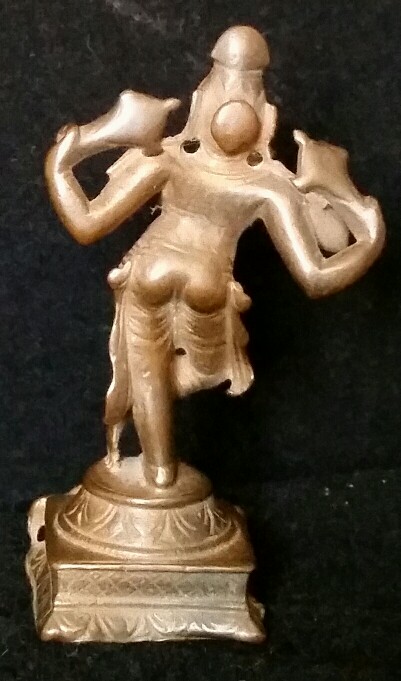 The delicate casting and the material (copper rich) suggests this is from Tamil Nadu, South India. It may date prior to the eighteenth century. It is about 8 cm in height.
