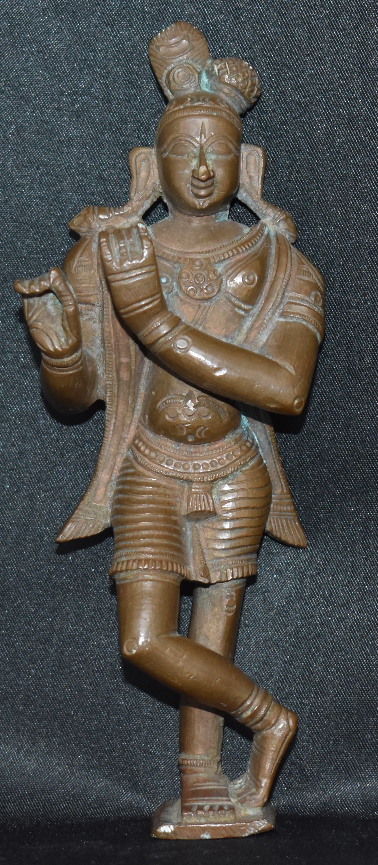 This is Venugopala, Krishna as a flute player. Though Krishna is an avatar of Vishnu, he is normally shown two-armed and without Vishnu’s attributes.