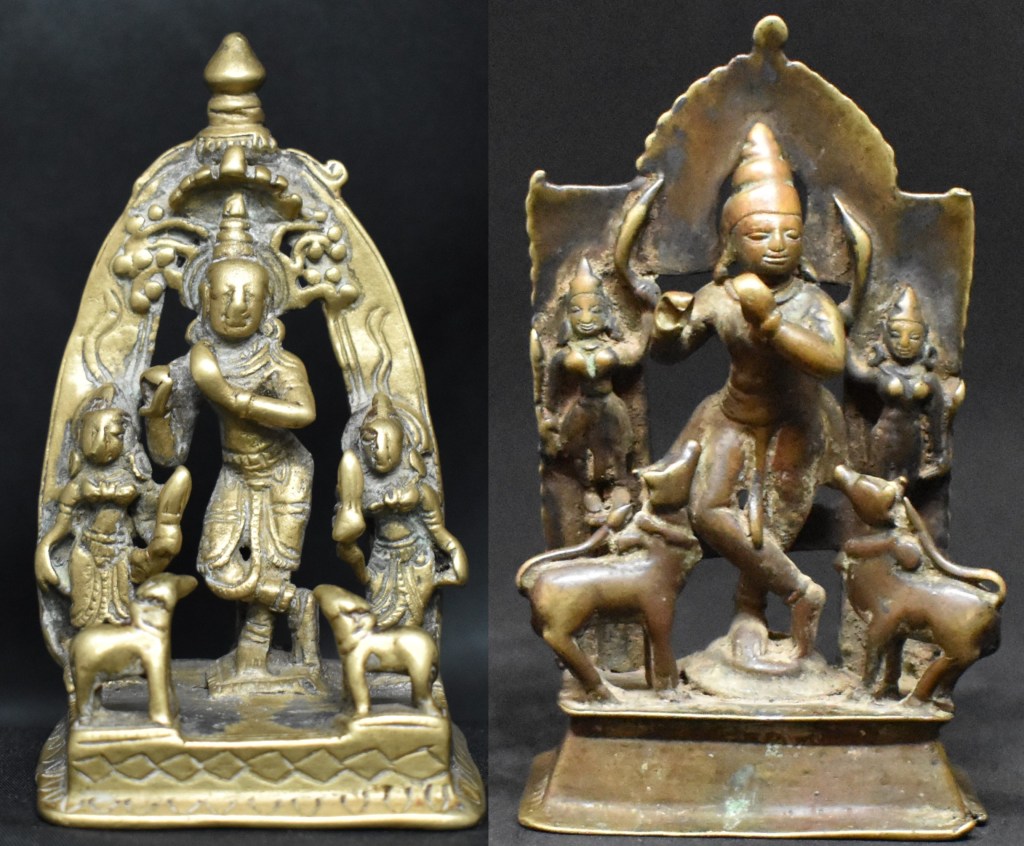 On this website, there is also a version of Venugopala accompanied by two attendants rather than his consorts. The distinction is made as the attendants hold Chamara, and the consorts have a halo around their heads, marking their divine quality. See the side-by-side comparison below.