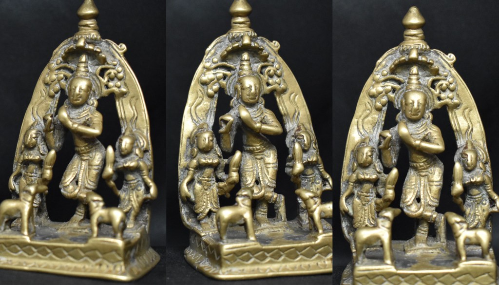 Krishn being a Vishnu Avataar, is having here two Sahiyyars ( consortium) of Vishnu on either side, ie Sridevi and Bhudevi. This appears to be a 16th cen piece of art.”
