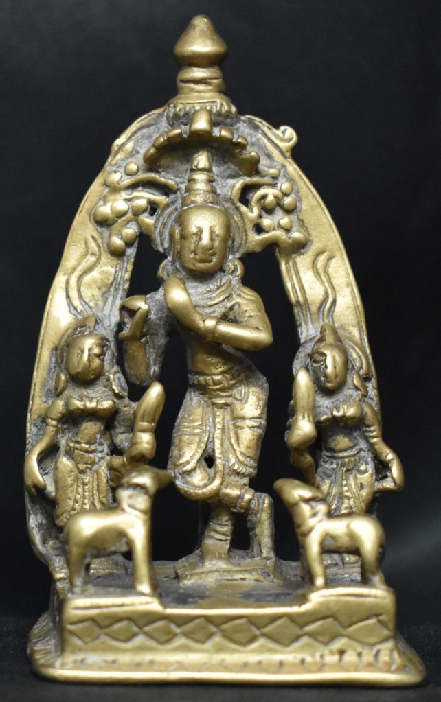The artist has gone the extra distance to make this bronze a cherished one. Take note of the engraving on the Prabhavali and the base, including the seven-hooded Cobra protecting the deity, the tree (possibly a Kadamba tree) framing his head, the halo of the consorts, and the cow’s gaze.