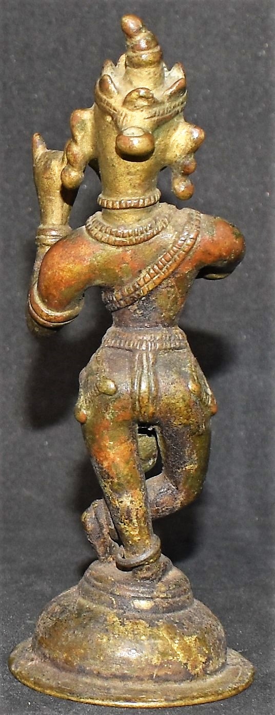 This idol is about 12cm high, and it is most likely it is from Orissa. The earrings, five-peaked tiara, and peaked crown are the reasons for the Orissa attribution. This may date to the nineteenth century.