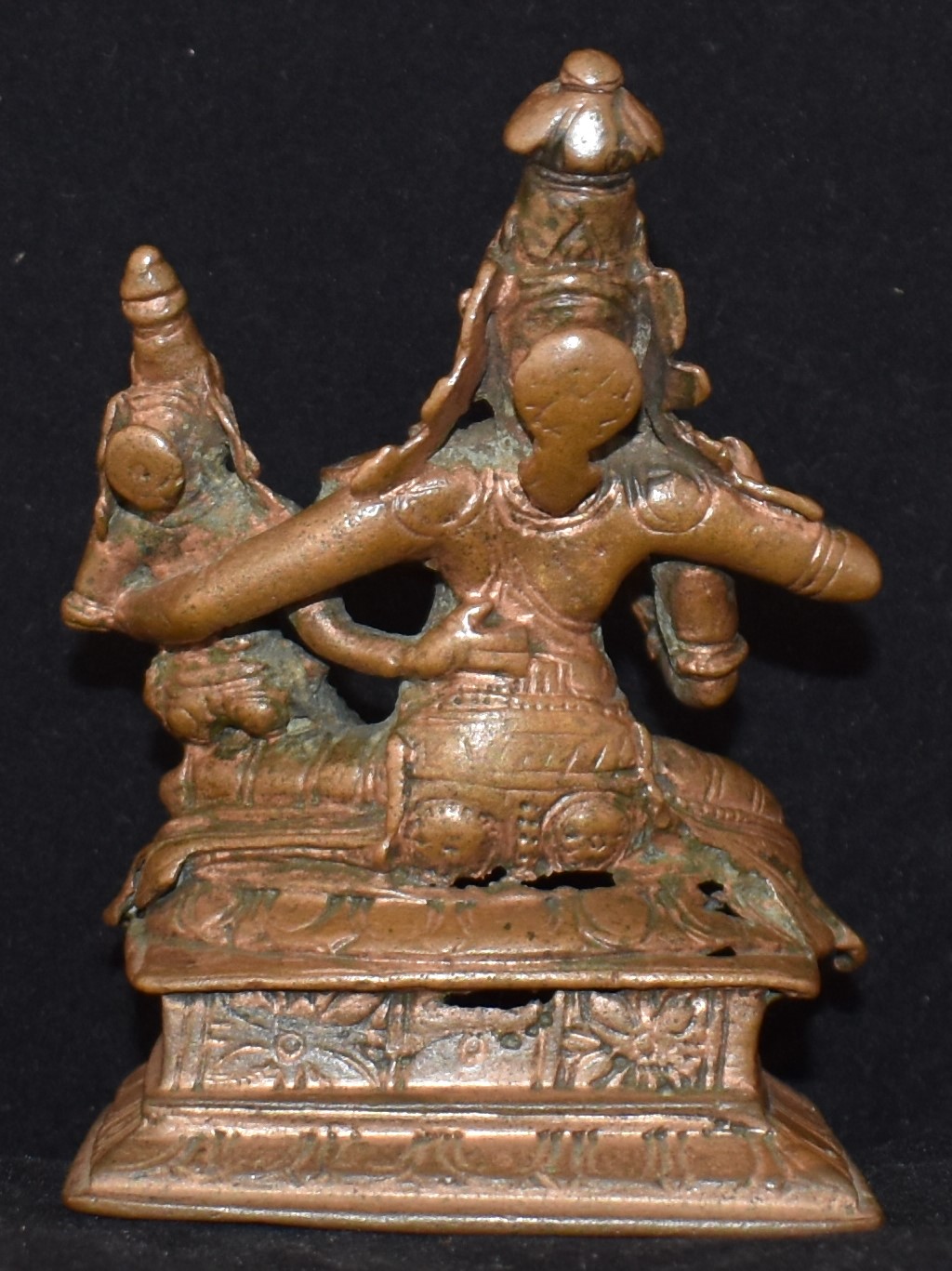 There is some damage to the piece, bronze loss and Krishna’s missing left hand. The ritual worship has resulted in some wear. It remains beautiful.