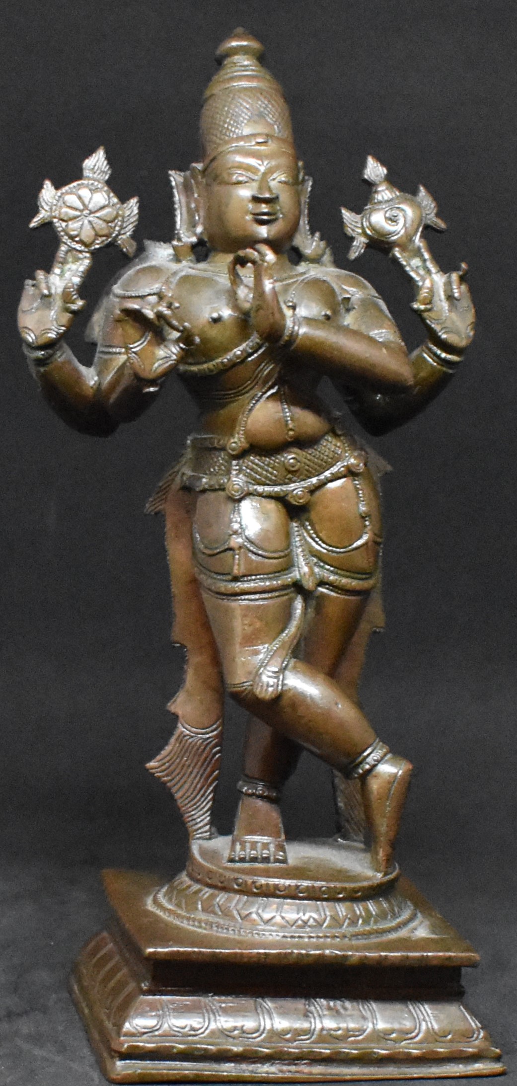This bronze figure represents the Hindu deity Krishna, the eighth incarnation of Vishnu. In this form, playing the flute, Krishna is known as Venugopala. Krishna is one of the most popular avatars of Vishnu and worshipped throughout India.