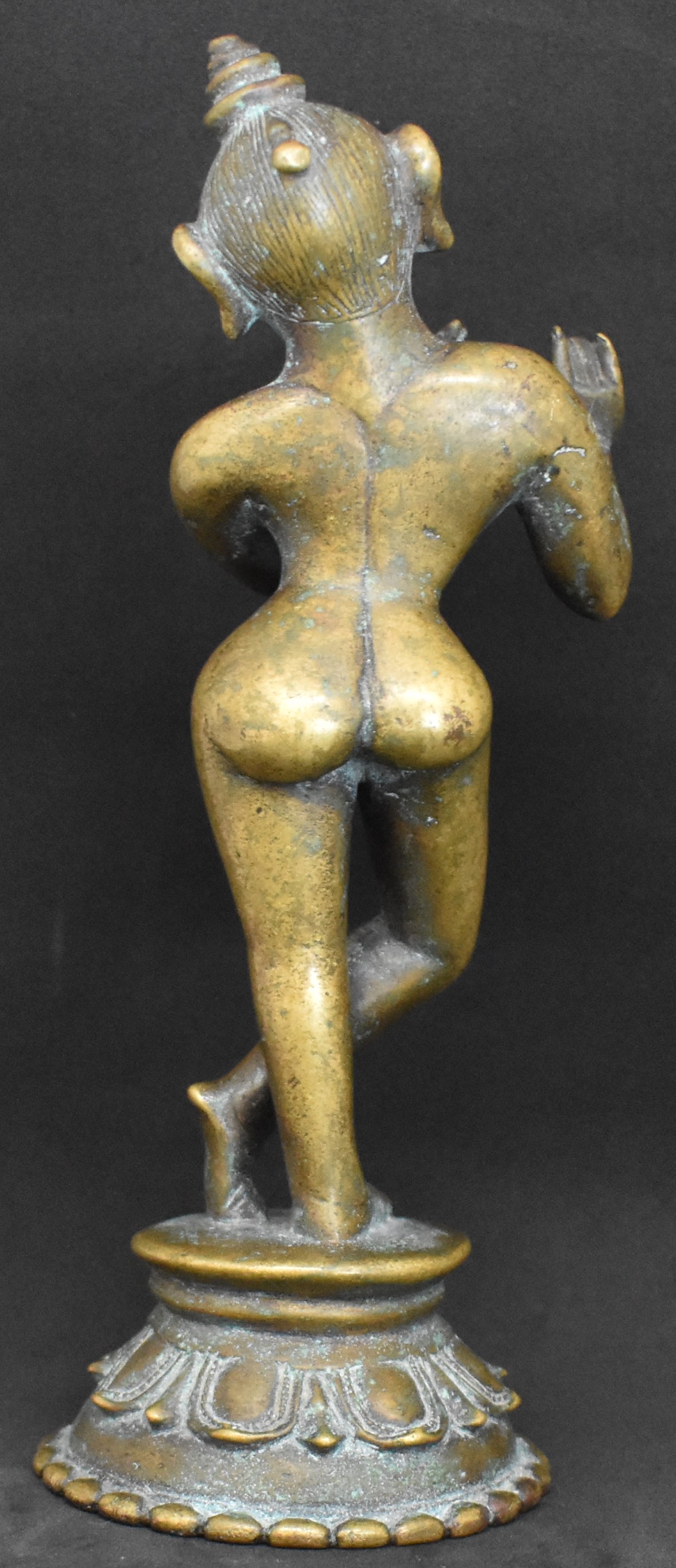 This is Krishna as Venugopala, the flute player. In this case, as it is more or less normal, the flute is missing. Venugopala standing in the typical style, with his right leg bent and crossed over the left leg. An inverted lotus supports the circular pedestal. The rim of the bottom portion is beaded.