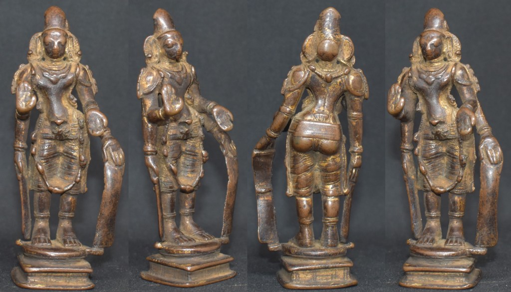 The vigraha is about 10.5 cm in height. It is, most likely, from Tamil Nadu.