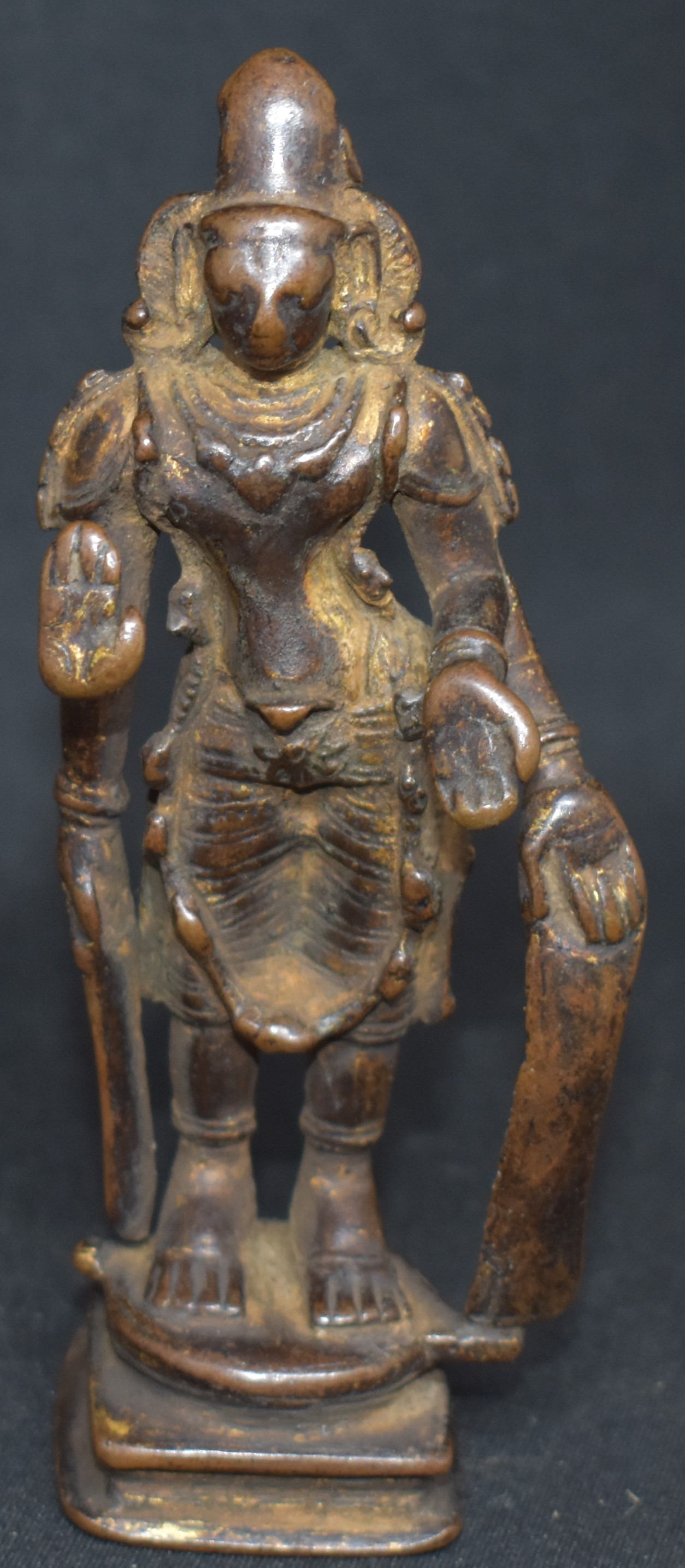 Well worn and gilded. Gilding is unusual for South Indian bronzes. This four-armed deity is holding a sword and a shield in his rear hands and his front hands are in Abhaya and Varada mudra (Protection and boon bestowing).