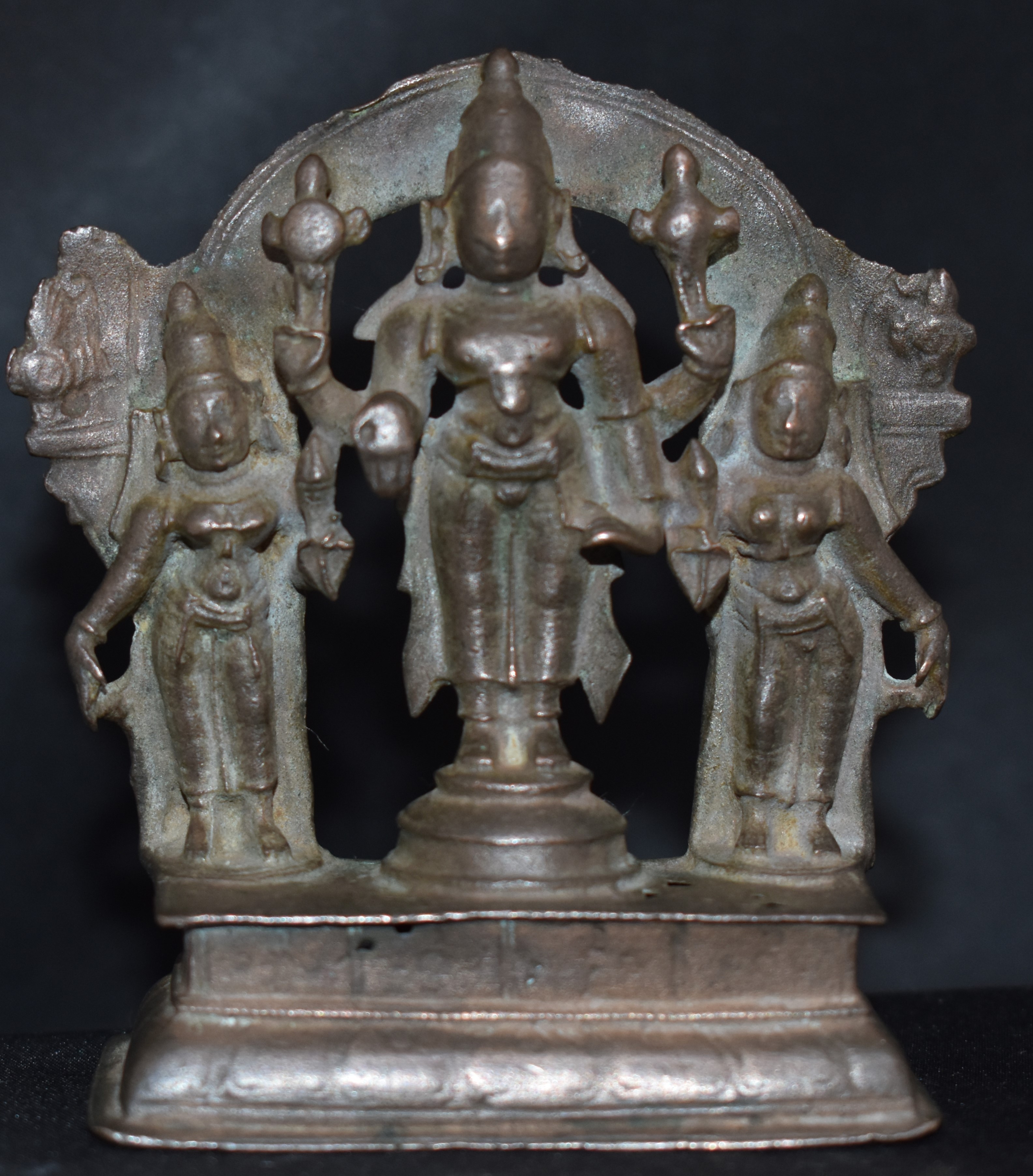 ” A cast bronze shrine figure depicting the god Vishnu, the preserver, and his wives Sri Devi and Bhu Devi. … Vishnu presents holding a pair of meditational implements in his back hands while holding the front hands in a mudra, his wives each brandishing a vajra as they lean towards him. “