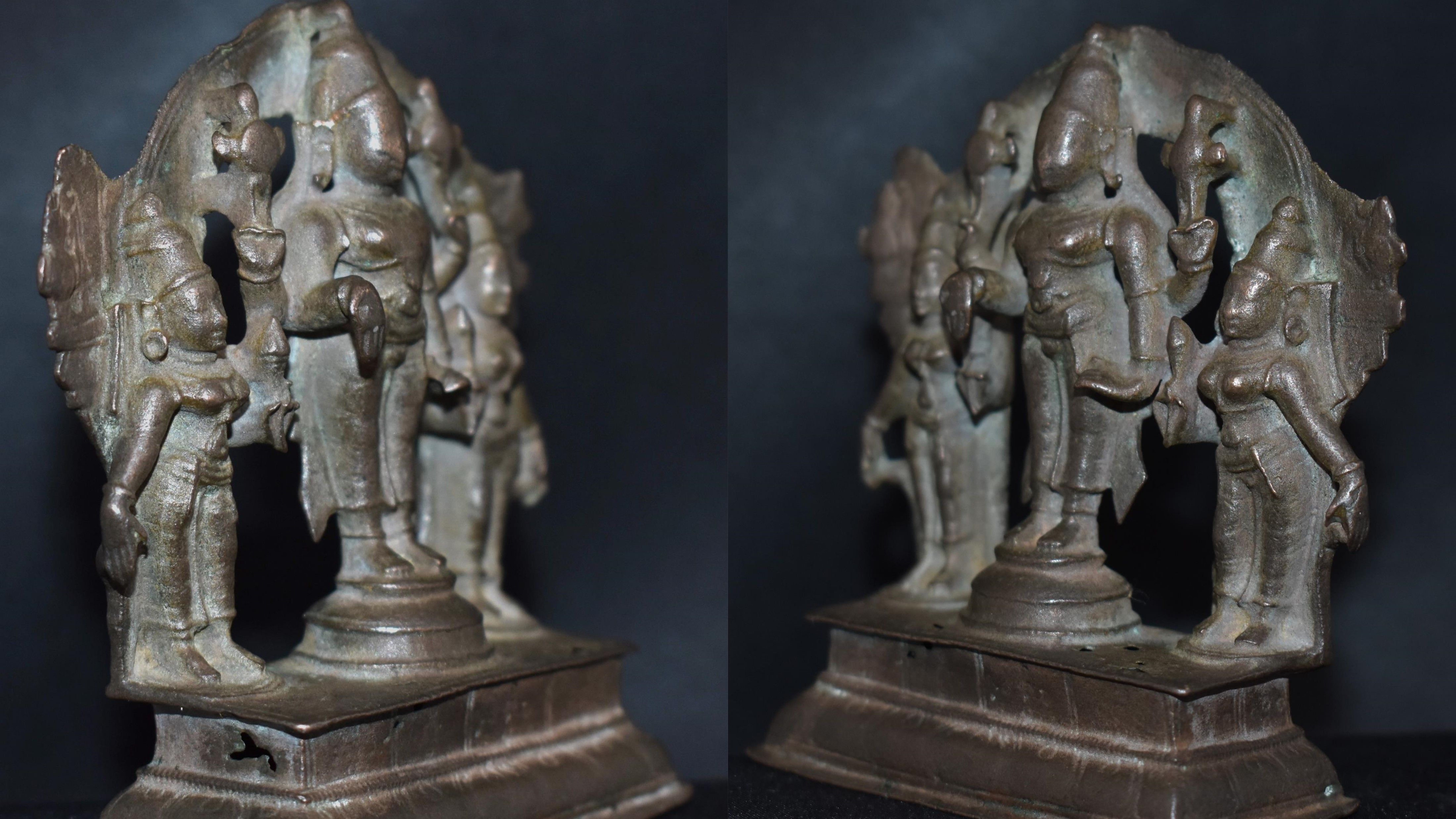 The quality of casting makes this bronze special. The side view of the Peetha shows how thin the casting is. What is even more special is this bronze is single cast. Note the shaping of consorts’ crown to join the Prabhavali and the way the consorts are cast integral to the vertical part of the Prabhavali.