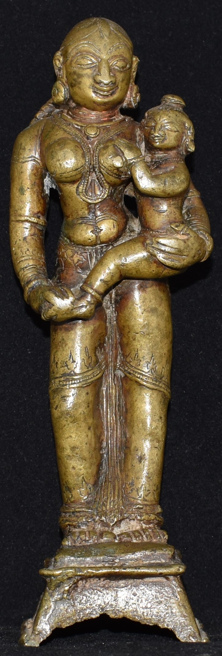 The naturalistic portrayal of Krishna supported at Yasodha’s hips, Yasodha’s stiffened left leg to show the weight on it, the depiction of Yasodha’s torso, Krishna’s playfulness and Yasodha’s right leg slightly bent as if she is about to step forward makes this bronze special.