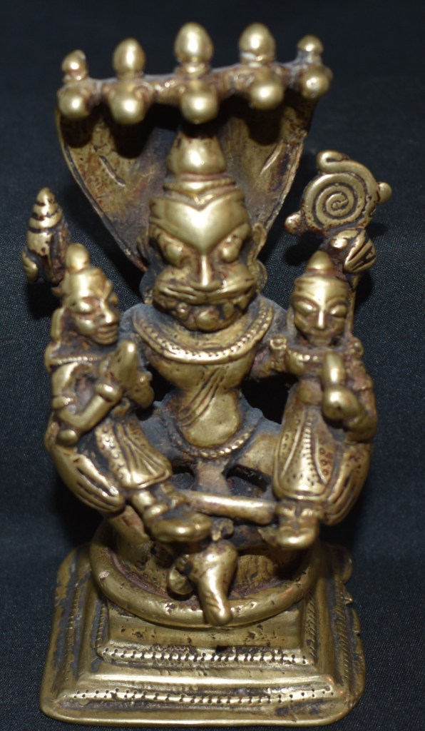 Narasimha is protected by the five-hooded Cobra. In this case. Narasimha is sitting on a mound and the cobra’s body coils around the mound. Narasimha’s rear hands are holding Shankha and Chakra. The ornamentation is simple.